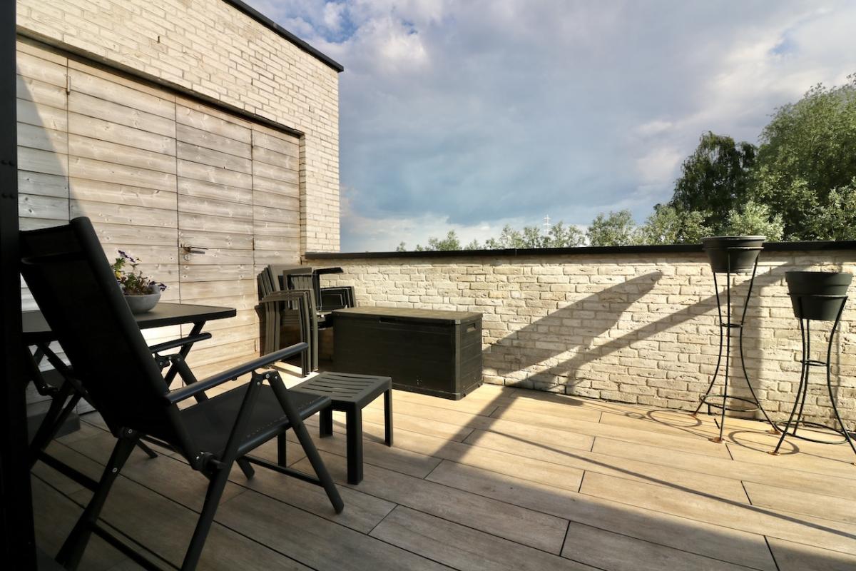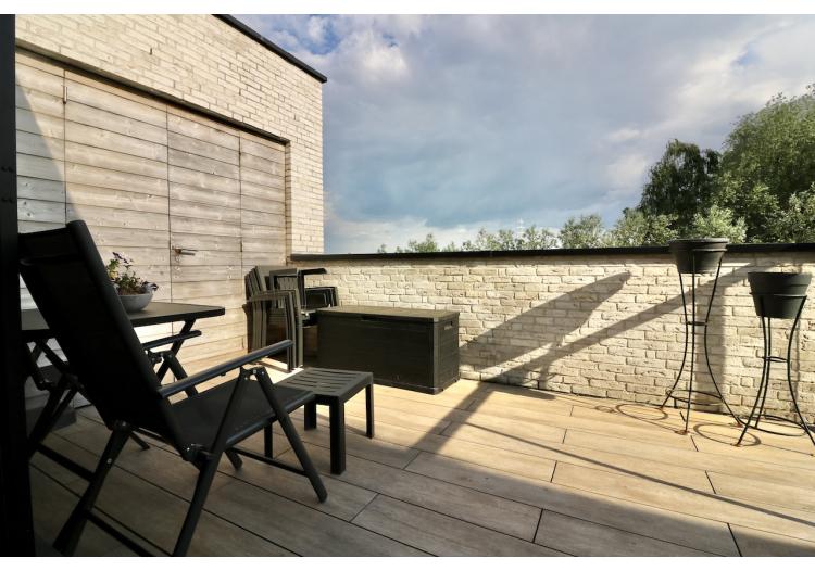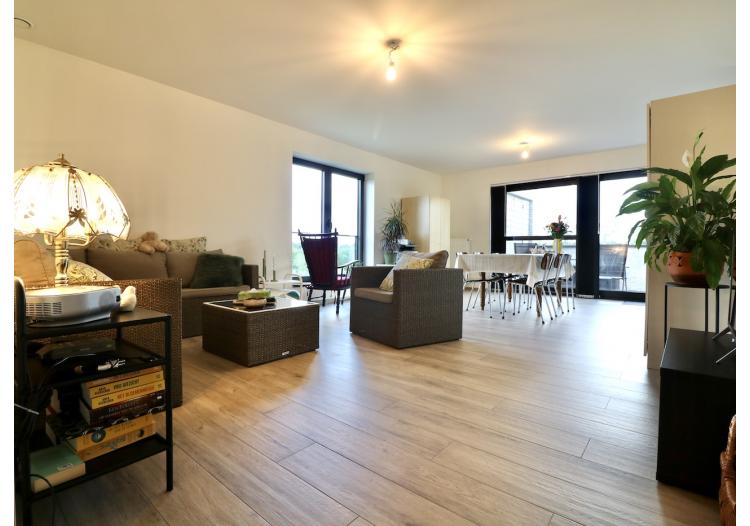 | Bevloering | Volkeramische tegels, parket in de leefruimte, laminaat in de slaapkamers en inkomhal |