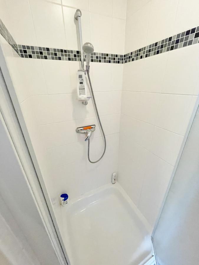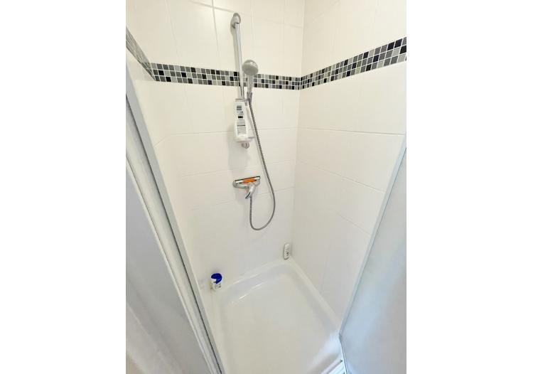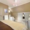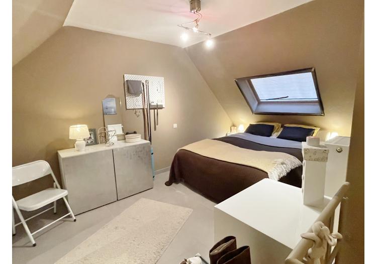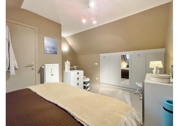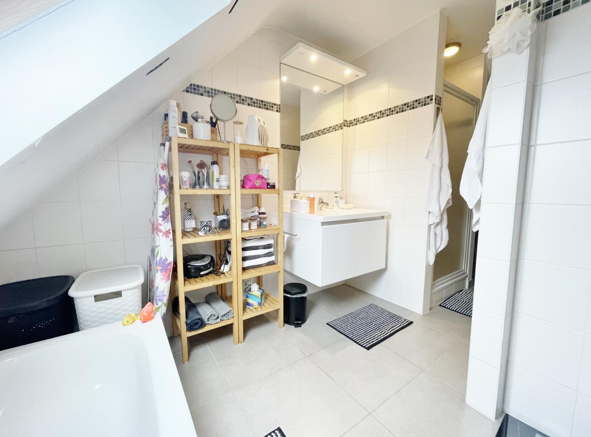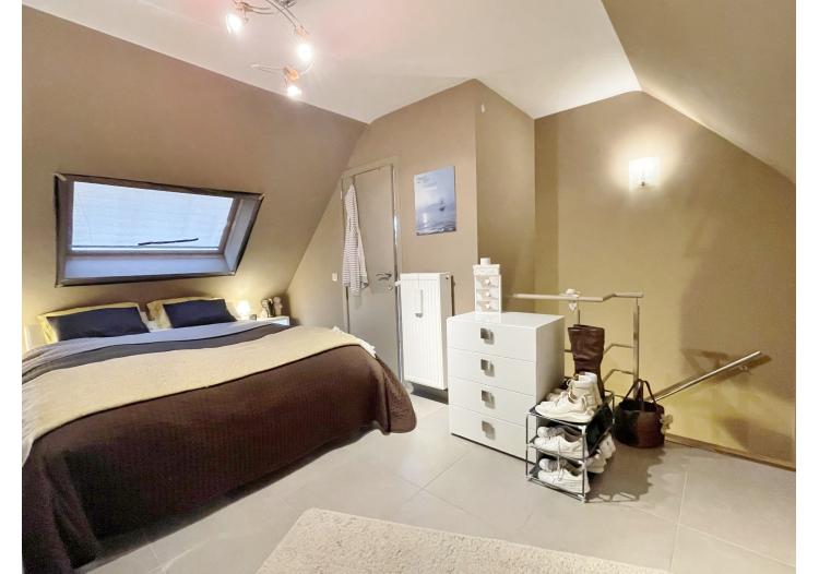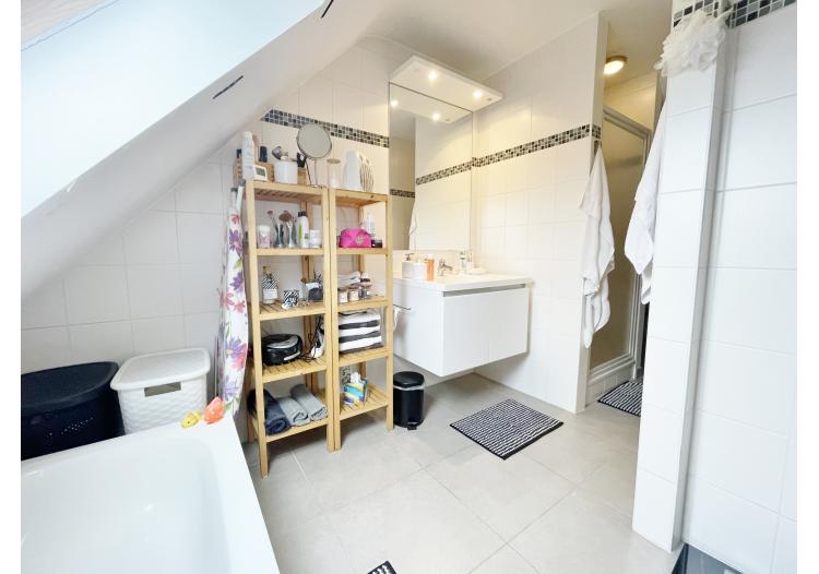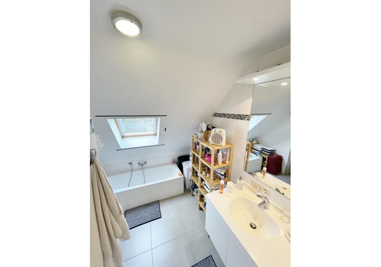De dakverdieping beschikt over een tweede slaapkamer met een aparte badkamer, uitgerust met zowel ligbad als douche, wat extra comfort biedt.