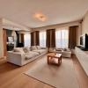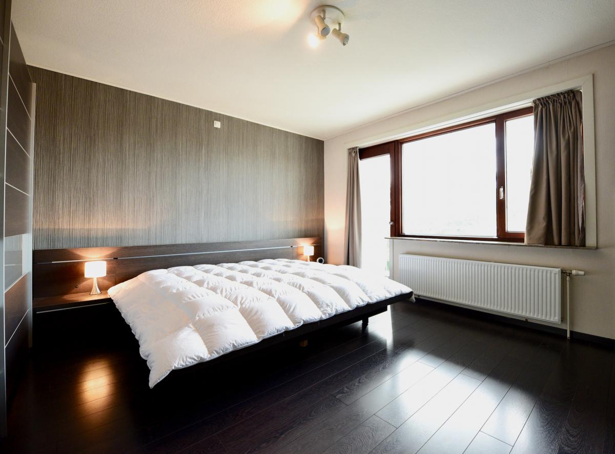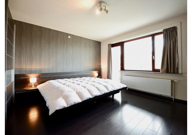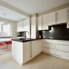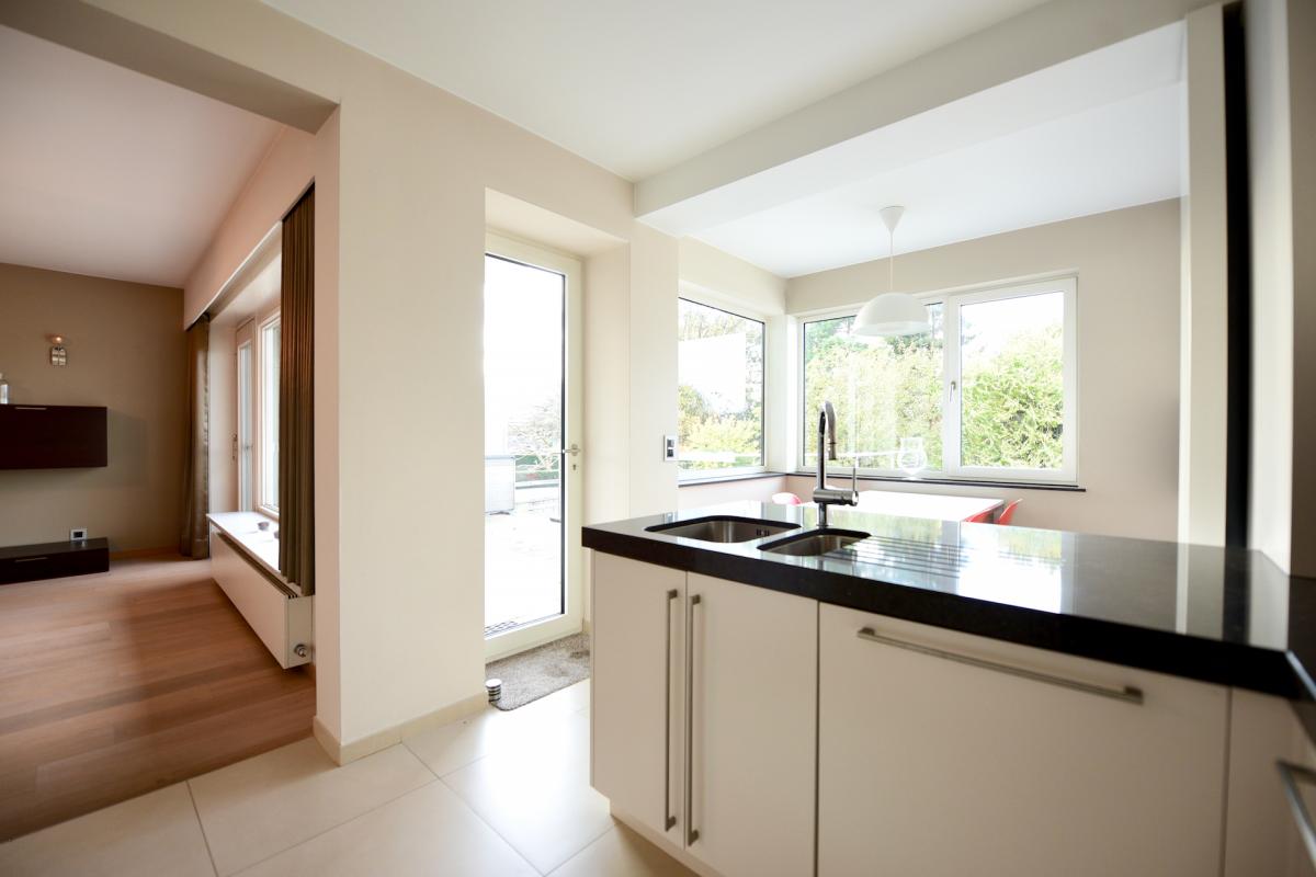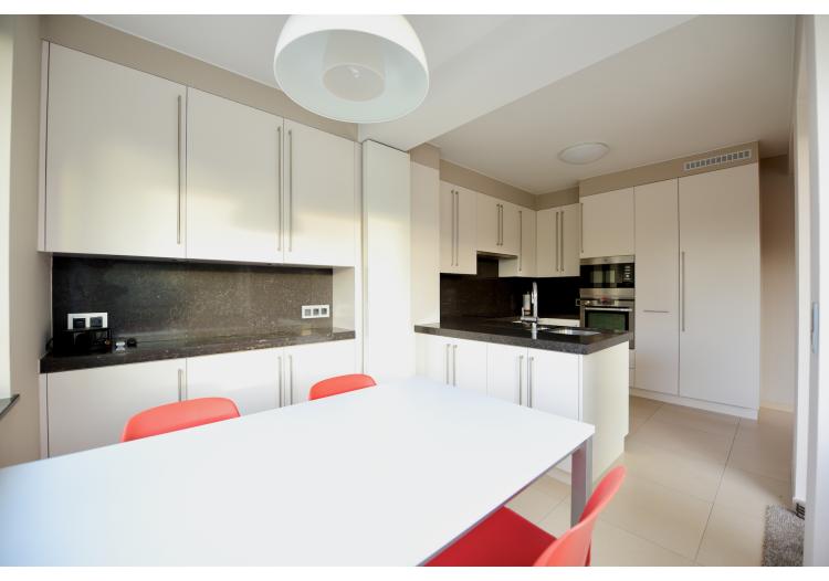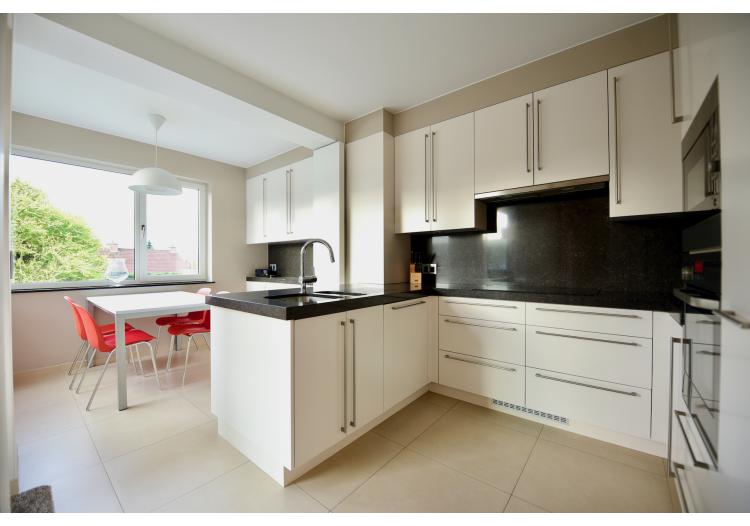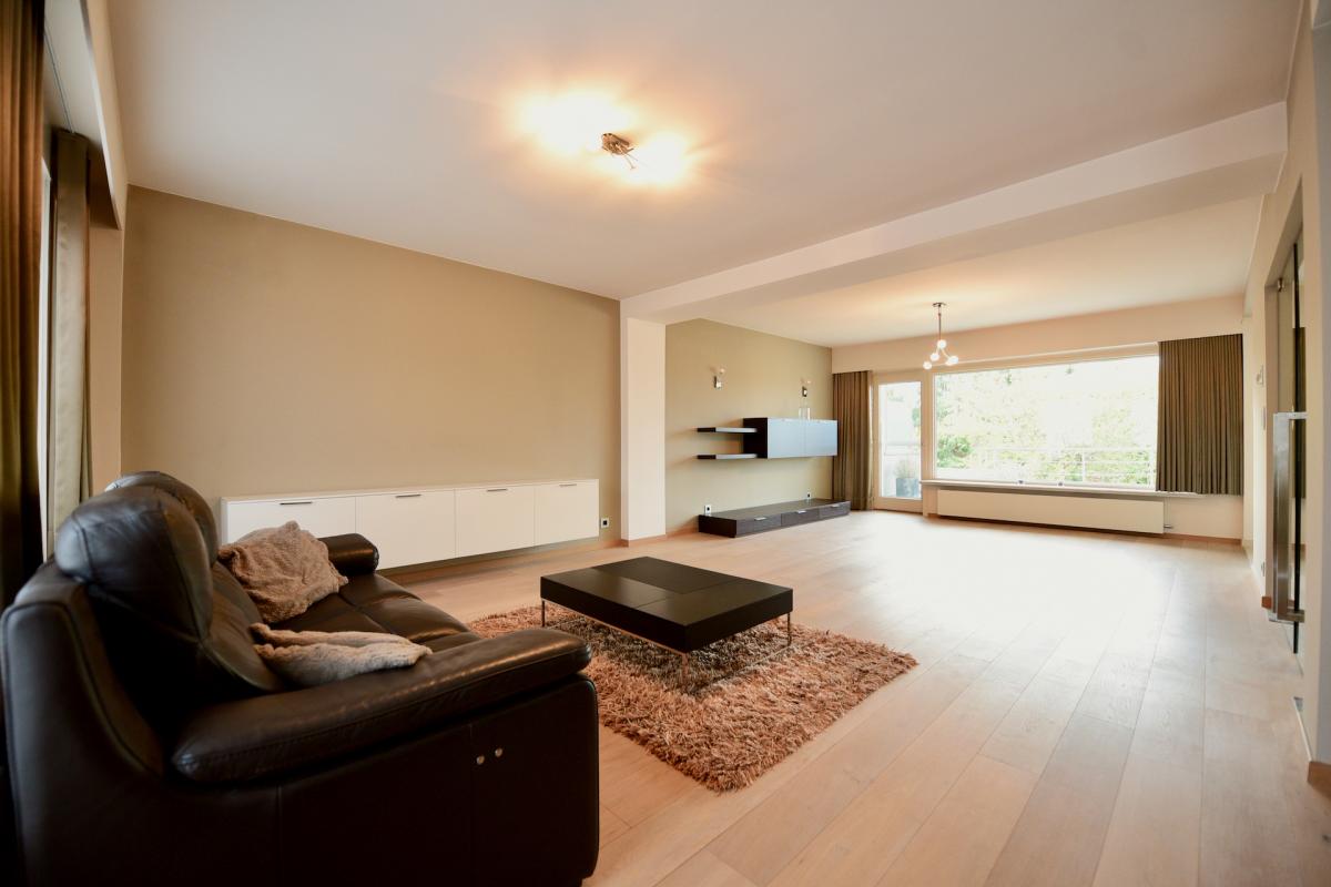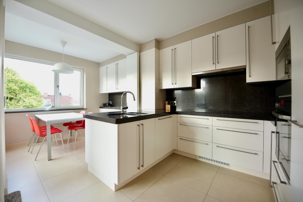 De leefruimte op de eerste verdieping is een ware lichtoase van klasse, uitgerust met grote ramen, dubbele glazen deuren, stijlvolle parketvloeren en ingebouwde kasten. Dit alles vormt een harmonieus geheel met een ruim terras van Padoek-hout. De strakke, volledig uitgeruste keuken met eetruimte biedt ook toegang tot dit zonnige terras, wat een vloeiende overgang tussen binnen en buiten faciliteert.