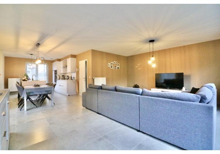 De indeling is als volgt: een ruime inkom met een gastentoilet, een lichtrijke woonkamer met open, volledig uitgeruste keuken en een wasplaats/berging.