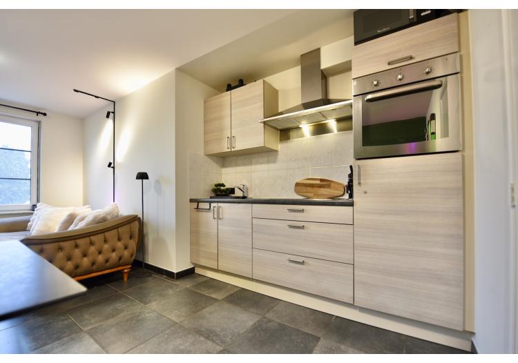 De lichtrijke leefruimte omvat een volledig praktische en ingerichte keuken, een eetplaats en een gezellige zitplaats.