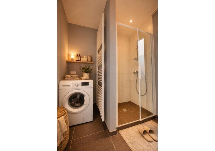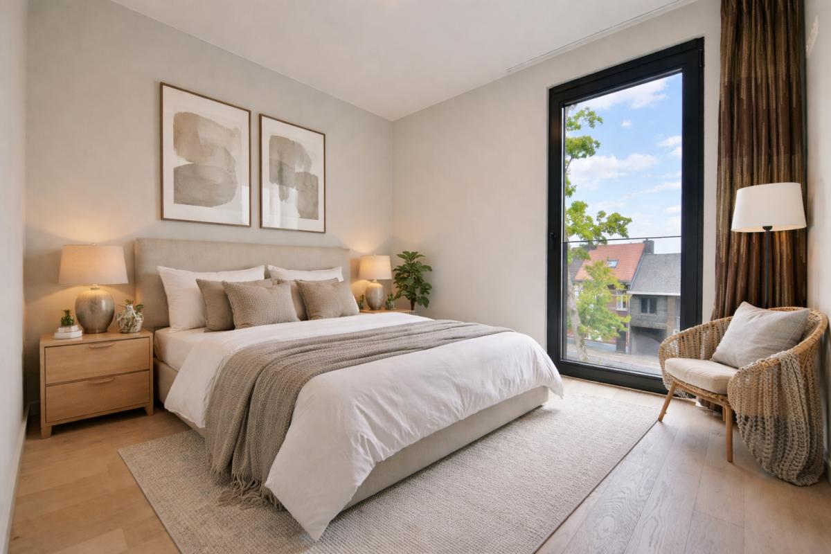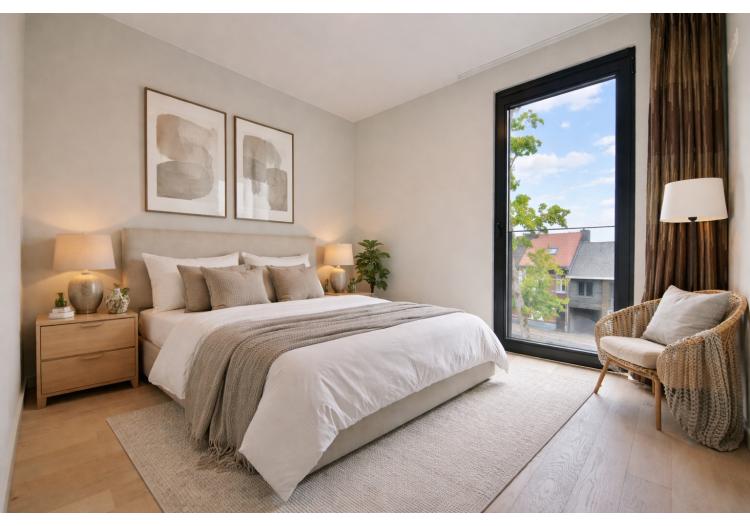De indeling is bijzonder praktisch en optimaal benut. Het appartement beschikt over twee volwaardige tweepersoonsslaapkamers. De eerste kamer leent zich perfect als comfortabele master bedroom of als stijlvol thuiskantoor met zicht op het groen, terwijl de tweede slaapkamer eveneens ruim en lichtrijk is. De moderne badkamer is uitgerust met een dubbele lavabo, een verzorgd badkamermeubel, een ruime inloopdouche en een aansluiting voor de wasmachine. Daarnaast is er een apart gastentoilet met lavabo. Elke ruimte werd doordacht ingericht met oog voor comfort en functionaliteit.
