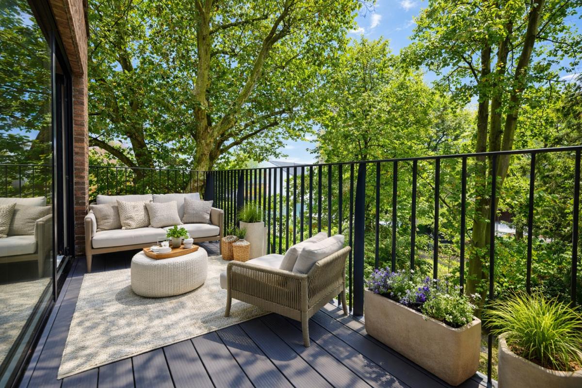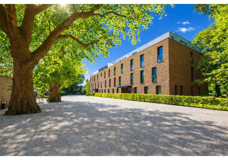 Het gebouw onderscheidt zich door zijn hedendaagse architectuur met strakke lijnen en hoogwaardige materialen. Binnenin wordt u meteen omarmd door een gevoel van ruimte en licht. De open leefindeling en de grote raampartijen zorgen voor een overvloed aan natuurlijke lichtinval en brengen het omliggende groen subtiel naar binnen. De lichtrijke leefruimte met open keuken vormt het hart van het appartement en sluit naadloos aan op een ruim, zuidgericht terras. Hier geniet u in alle privacy van de zon en het rustgevende uitzicht op volwassen bomen – een aangename buitenruimte waar elk seizoen zijn eigen charme heeft.