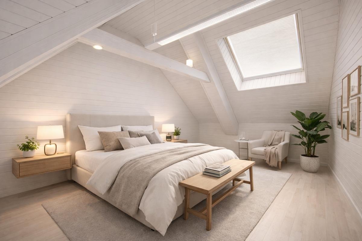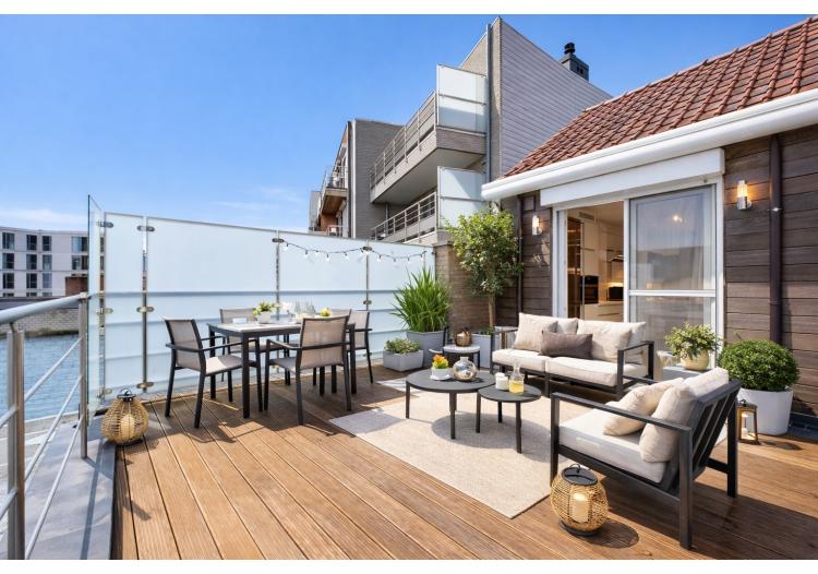 Op de verdieping geniet u van een warme, open leefruimte met tijdloze keuken, eetplaats en salon, met zicht op het tweede zonneterras en de tuin. Verder beschikt de woning over een ruime slaapkamer met ingemaakte kasten en een afgewerkte zolderkamer die perfect kan dienen als tweede slaapkamer of extra bergruimte.