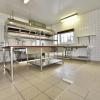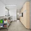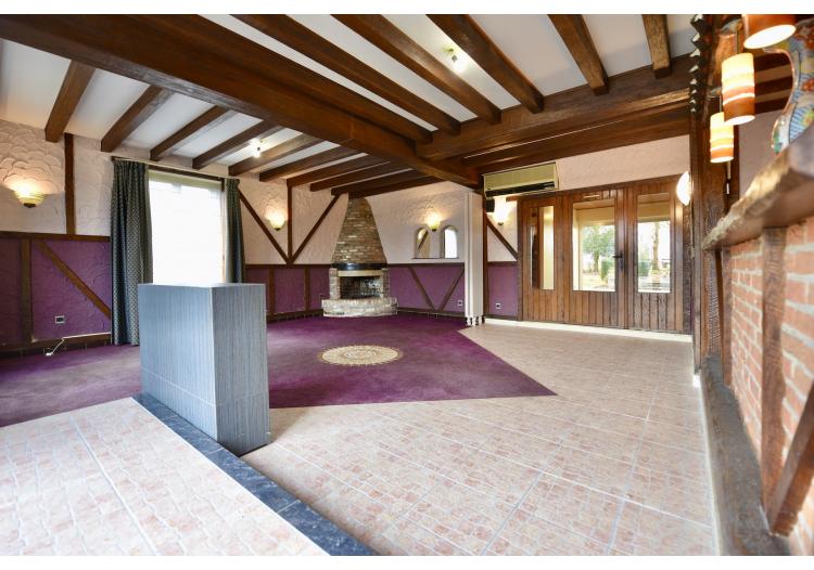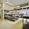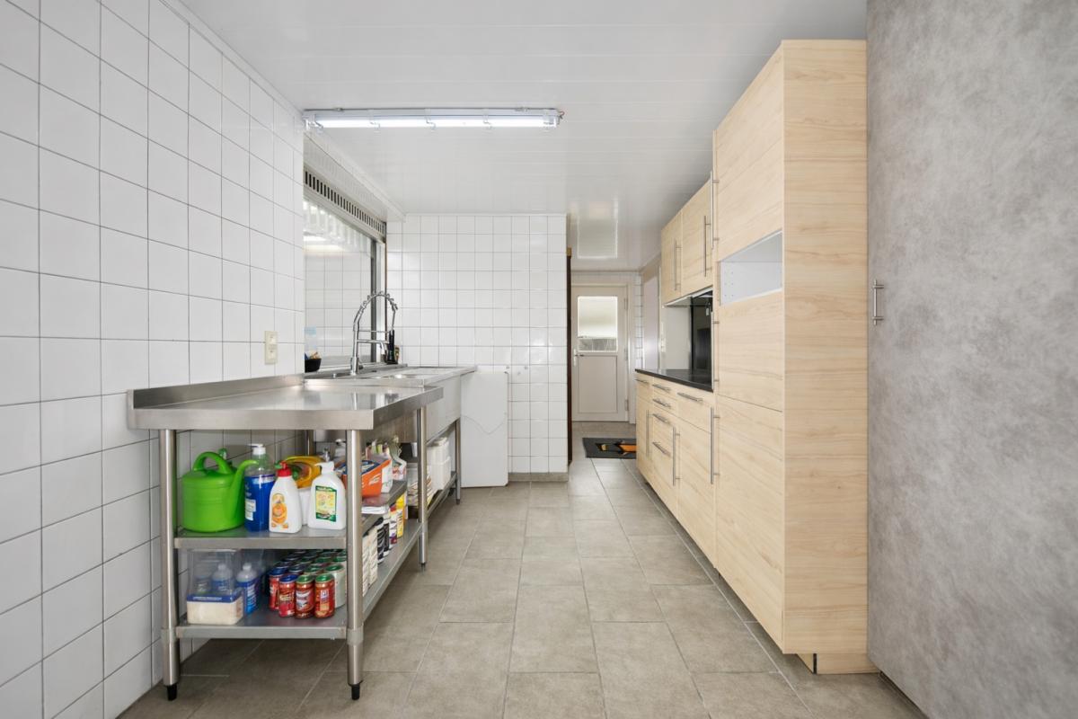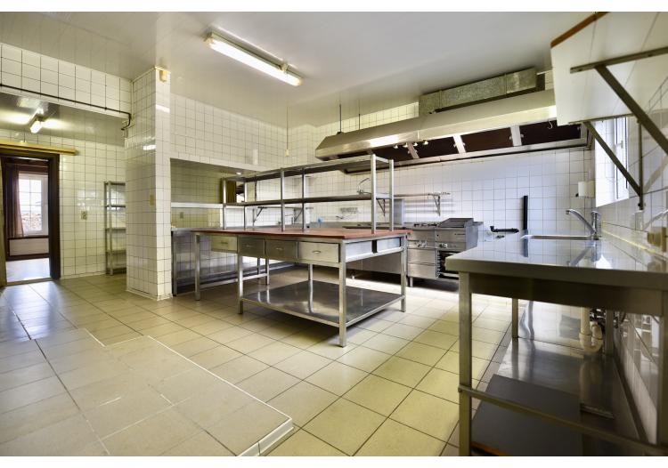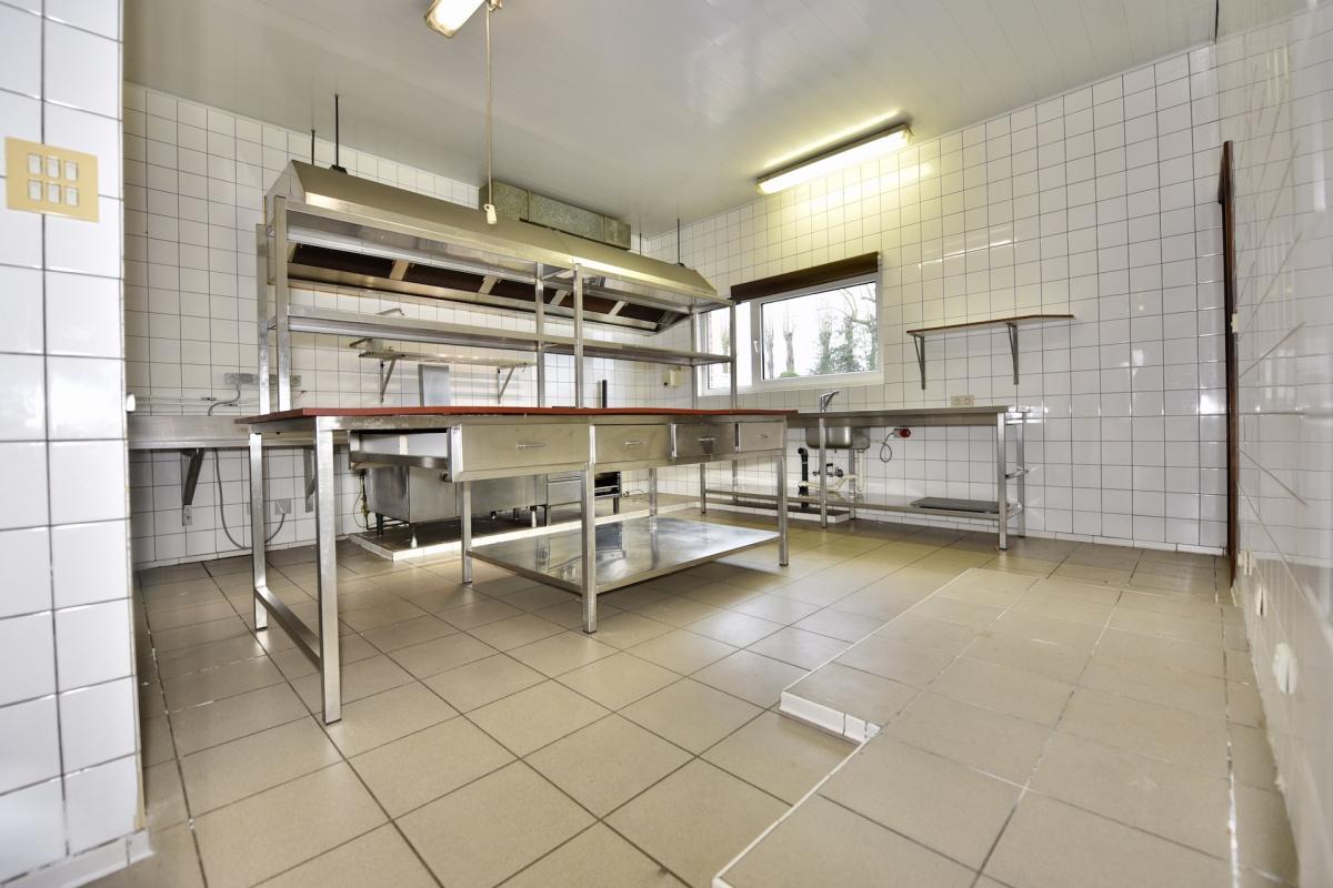 | Keuken 1 | professionele keuken met inox toestellen/rekken voorzien van meerdere gootstenen, een professioneel gaskookfornuis met vijf pitten, inox eiland en houtlook ingemaakte keukenkasten, ruimte om een grote koelkast/koelcel te plaatsen, dampkap. Aansluiting op gasflessen. | |