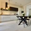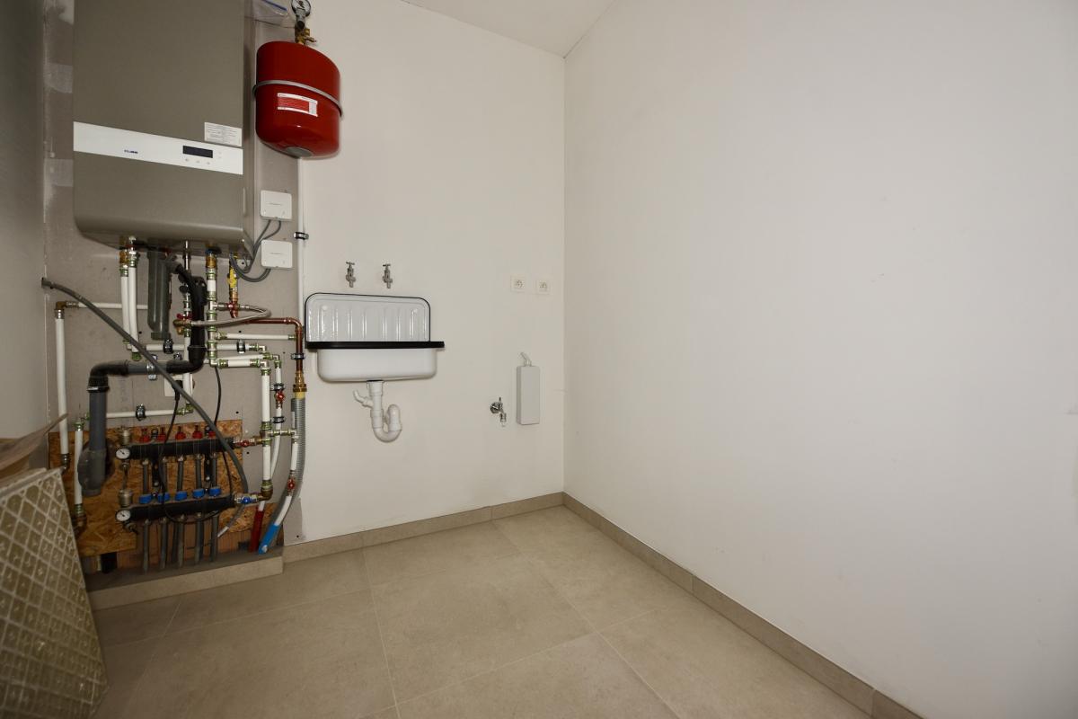 De open leefruimte met keuken, eetplaats en zitplaats baadt in het licht en biedt een mooi zicht op het terras en de stadstuin. Aansluitend aan de keuken bevindt zich een praktische berging die ook als wasplaats fungeert.