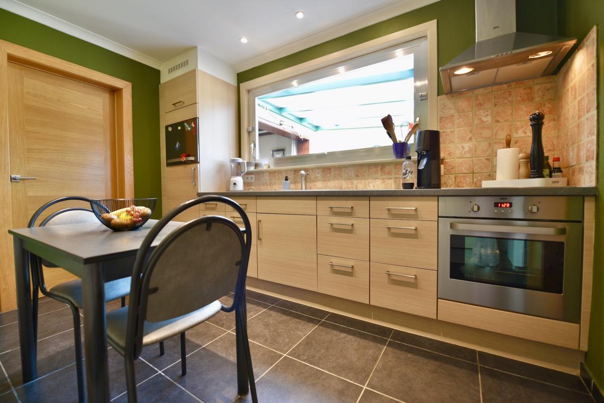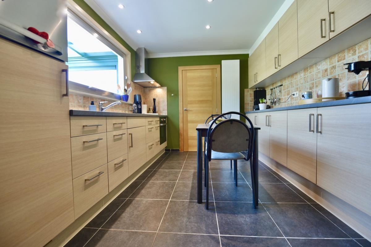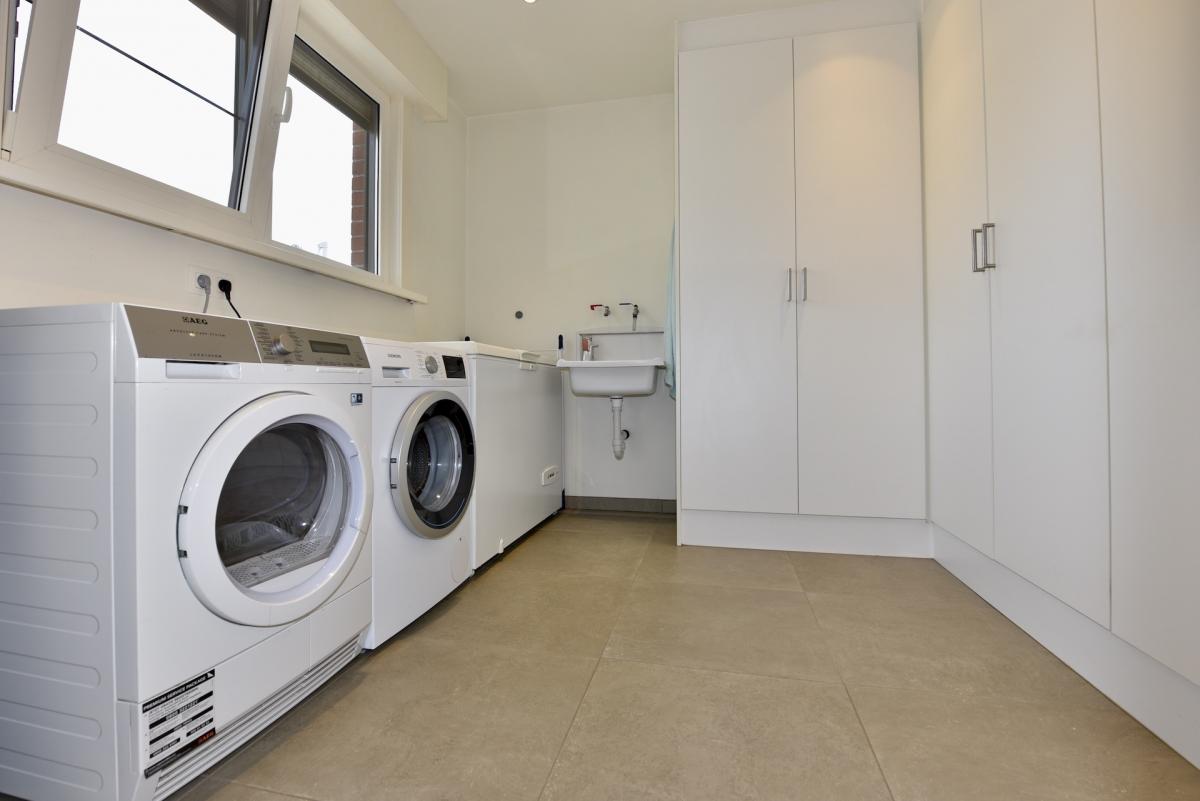 Naast de keuken beschikt u over een praktische wasplaats met ingemaakte kasten en een apart gastentoilet.een berging onder de trap.