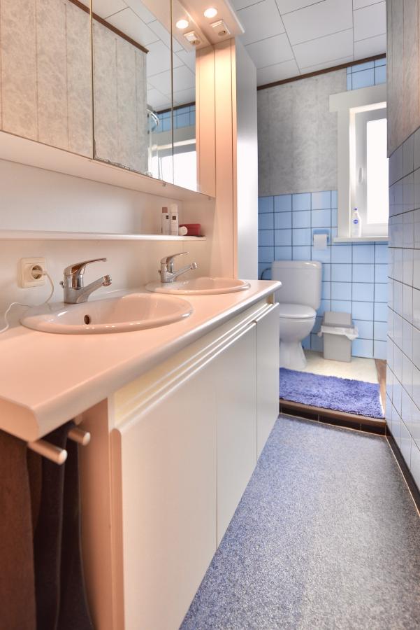 Op de eerste verdieping zijn twee volwaardige twee-persoons slaapkamers, één eenpersoonsslaapkamer en een badkamer met dubbele lavabo, douchecabine en toilet.