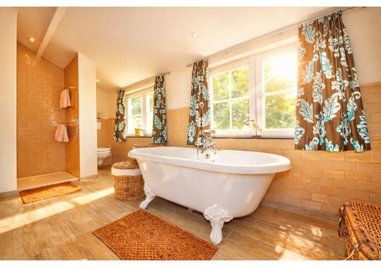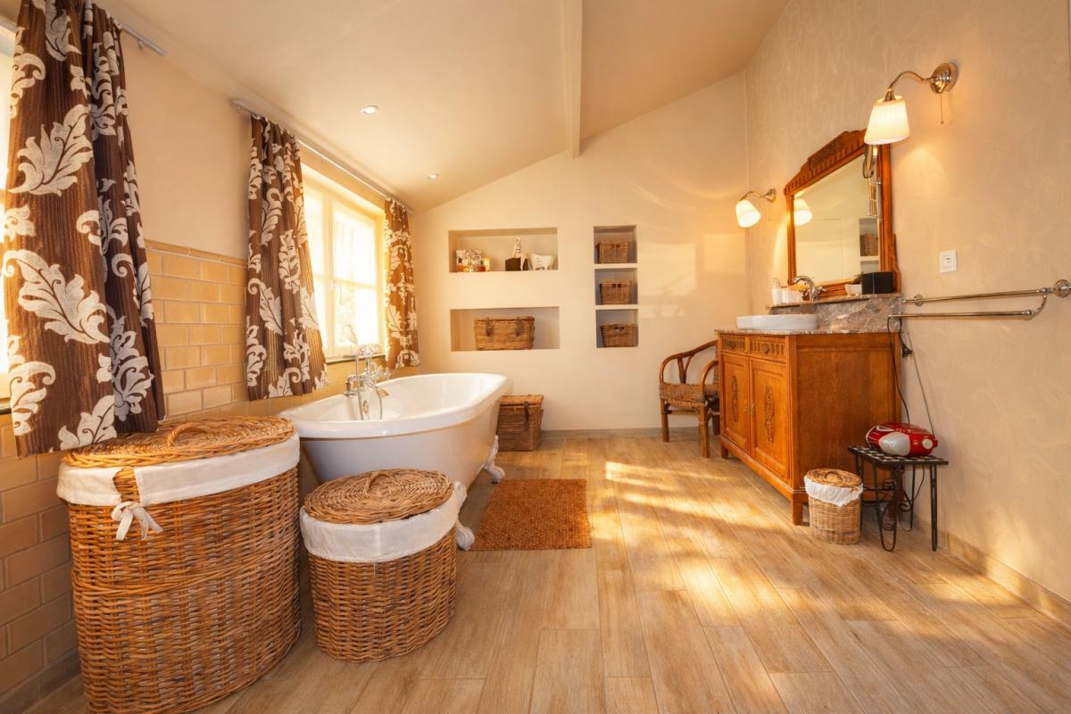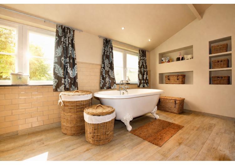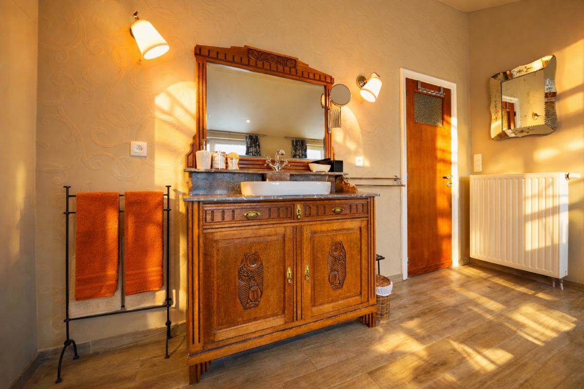 Op de eerste verdieping bevinden zich drie volwaardige tweepersoonsslaapkamers, waarvan één met dressing. Elke kamer geniet van een open en groen uitzicht, met zicht op een grote vijver – een oase van rust en privacy. De charmante badkamer ademt klasse en elegantie, en is uitgerust met een romantisch bad op pootjes, een inloopdouche, toilet en uniek lavabomeubel, afgewerkt met duurzame en kwalitatieve materialen.