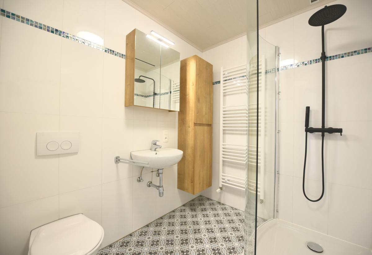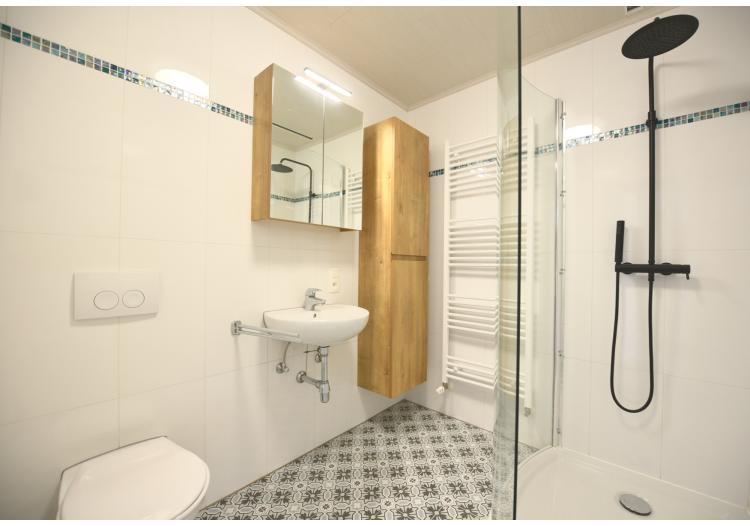 een inkomhal met een gastentoilet, een leefruimte met open keuken die voorzien is van alle hedendaagse comfort, 2 slaapkamers waarvan u toegang heeft tot het zonovergoten terras, een badkamer met douche, wastafel, badkamermeubel en toilet, wasplaats en een * garage (optioneel bij te huren 60 EUR/mnd). De toiletten en de wasmachine zijn aangesloten op regenwater.