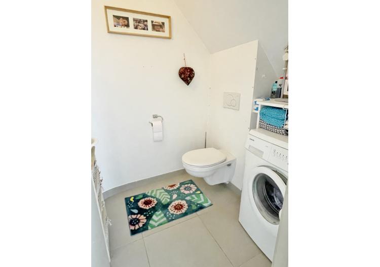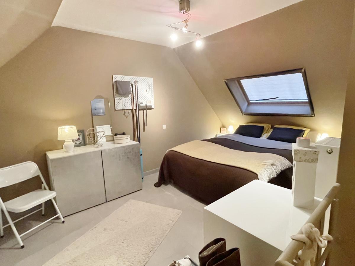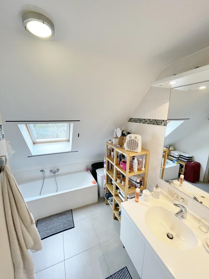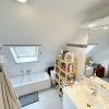 De dakverdieping beschikt over een tweede slaapkamer met een aparte badkamer, uitgerust met zowel ligbad als douche, wat extra comfort biedt.
