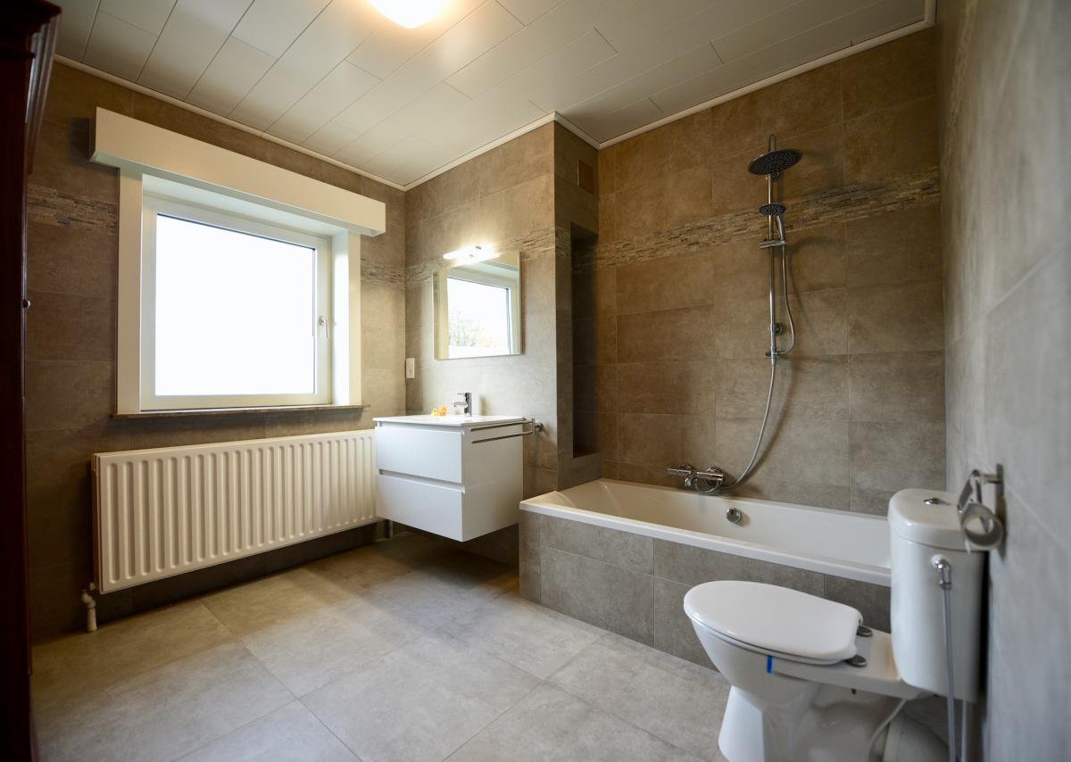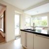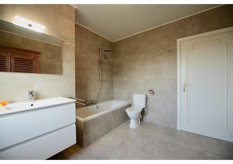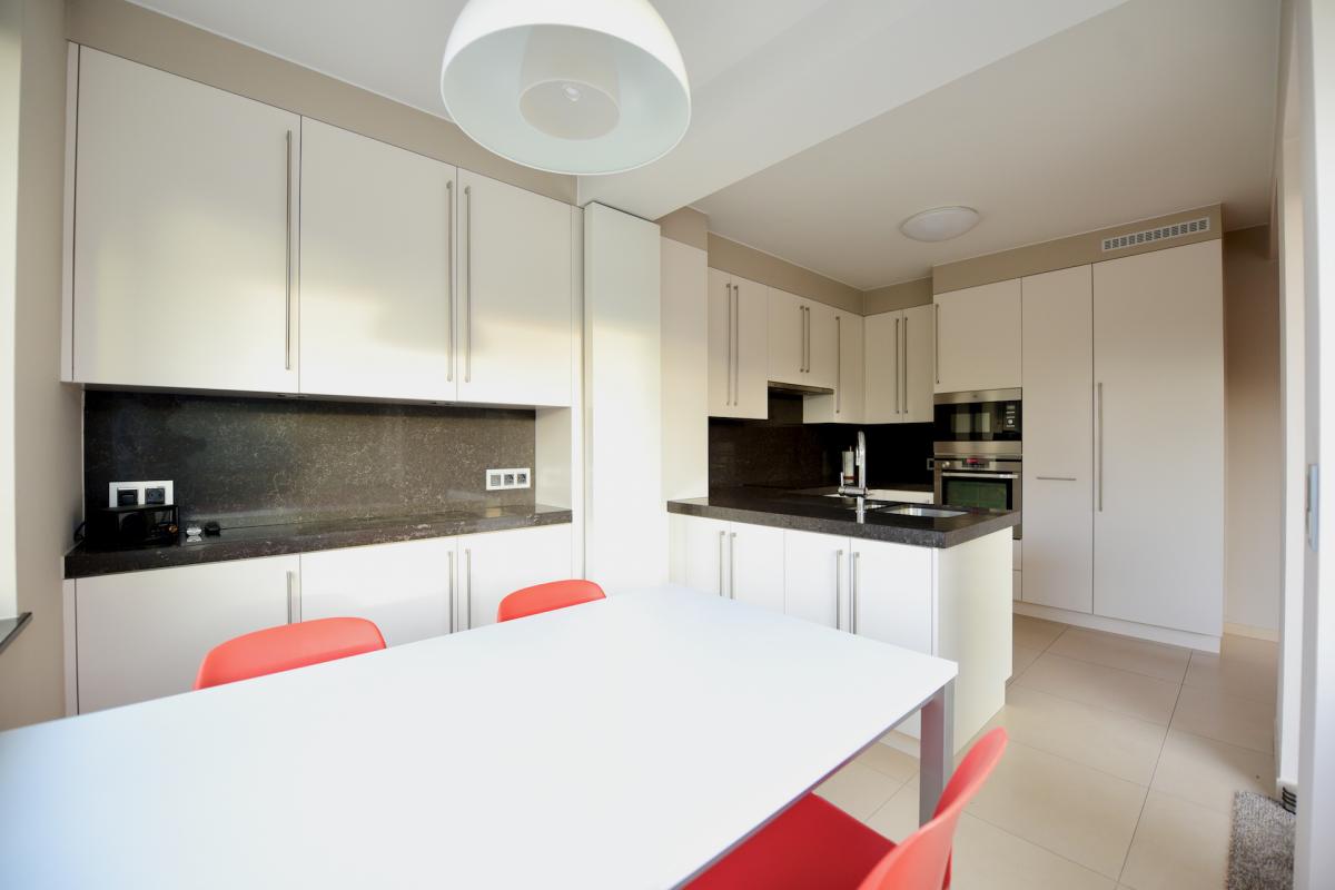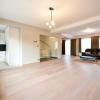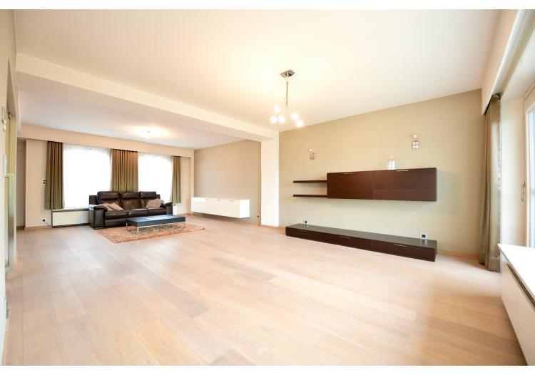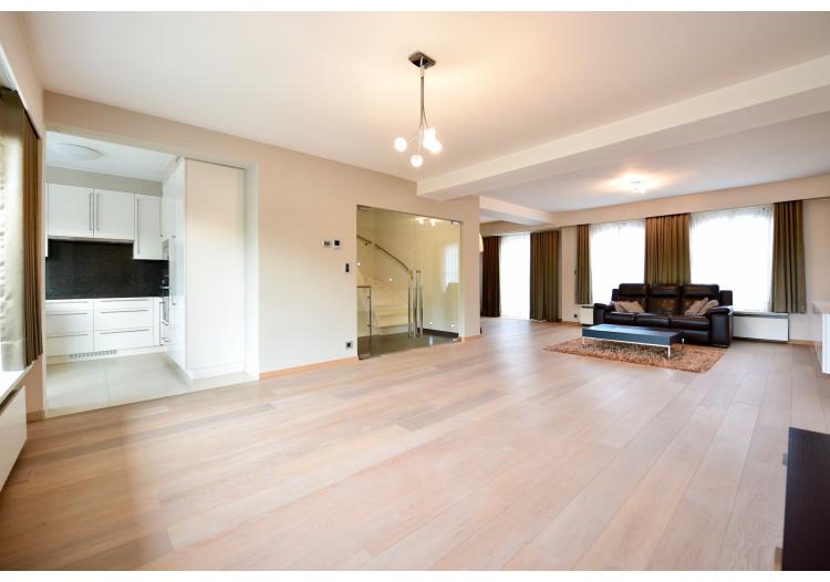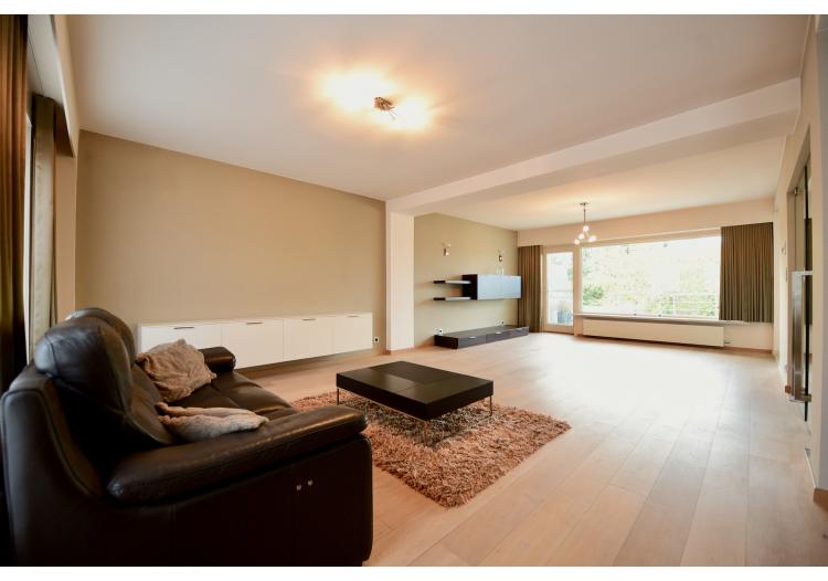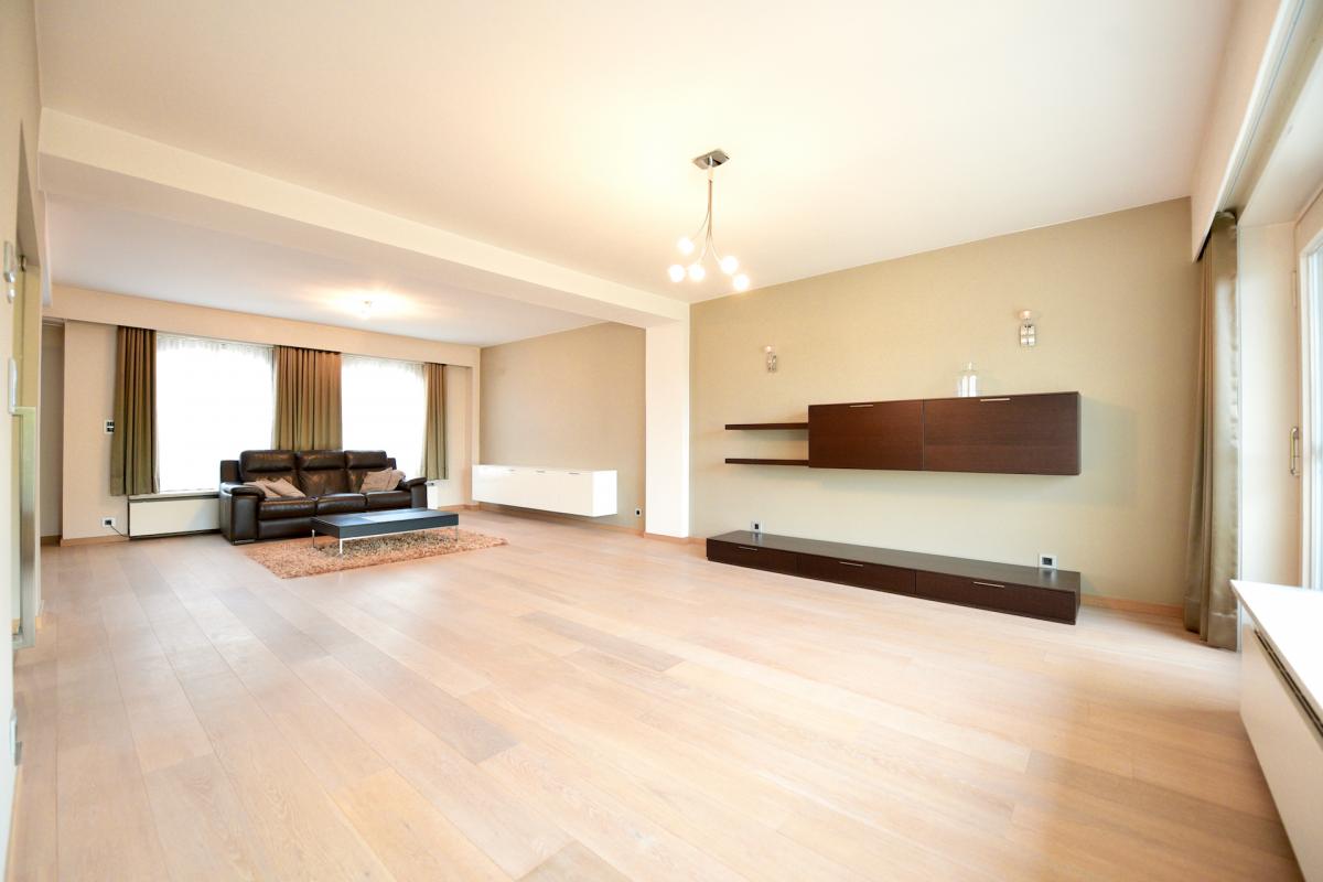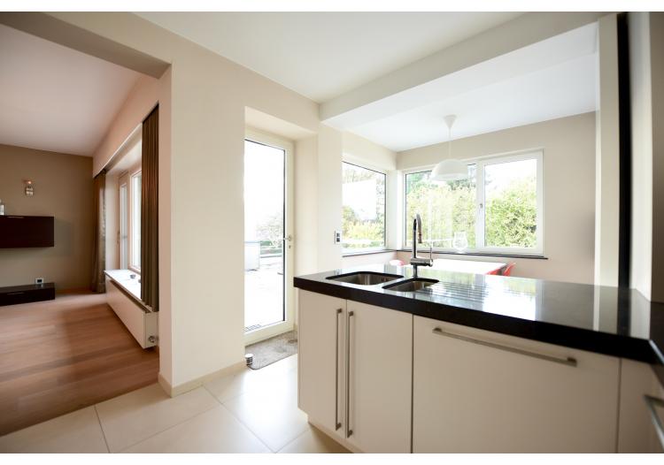 De leefruimte op de eerste verdieping is een ware lichtoase van klasse, uitgerust met grote ramen, dubbele glazen deuren, stijlvolle parketvloeren en ingebouwde kasten. Dit alles vormt een harmonieus geheel met een ruim terras van Padoek-hout. De strakke, volledig uitgeruste keuken met eetruimte biedt ook toegang tot dit zonnige terras, wat een vloeiende overgang tussen binnen en buiten faciliteert.