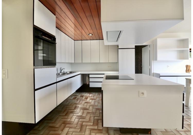 De keuken is compleet uitgerust om er je beste kookkunsten naar boven te halen. Het kookeiland met de aanpalende eetplaats maken het plaatje af. De praktische bijkeuken/ berging en wasplaats zijn gesitueerd naast de keuken.