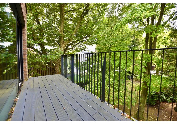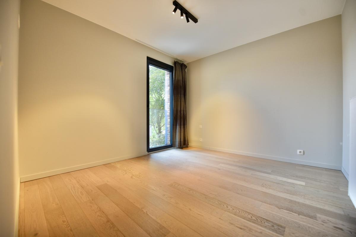 U betreedt de inkom en kan meteen gebruik maken van de lift die u tot de tweede verdieping brengt. Een eerste tweepersoonsslaapkamer of bureau met een zicht over prachtig groen verwelkomt u in dit privatief.