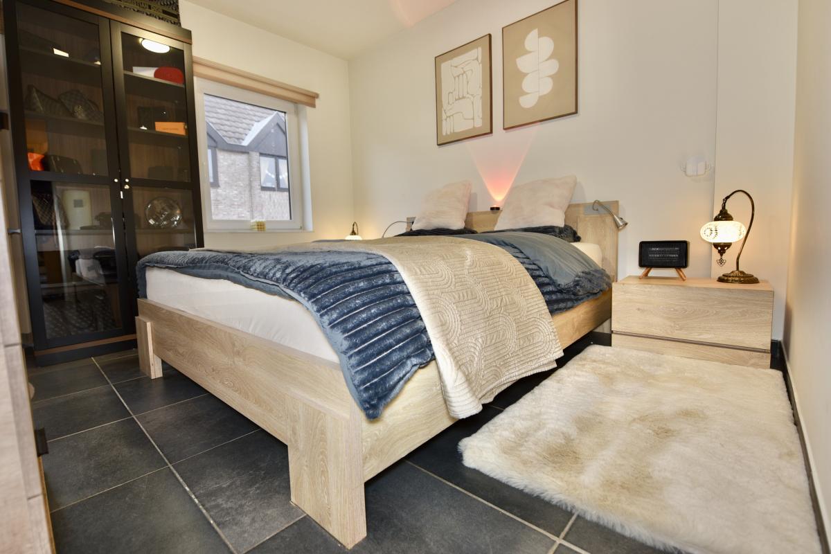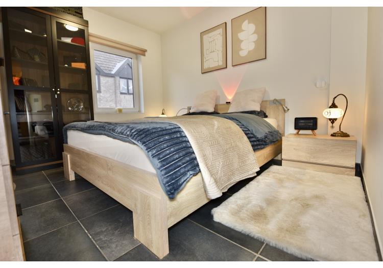 Een grote tweepersoonsslaapkamer biedt ruimte voor een bed en meerdere kasten.
