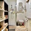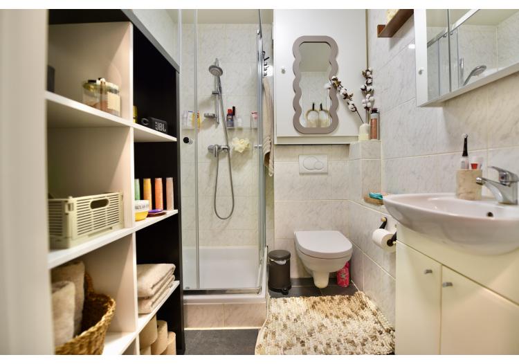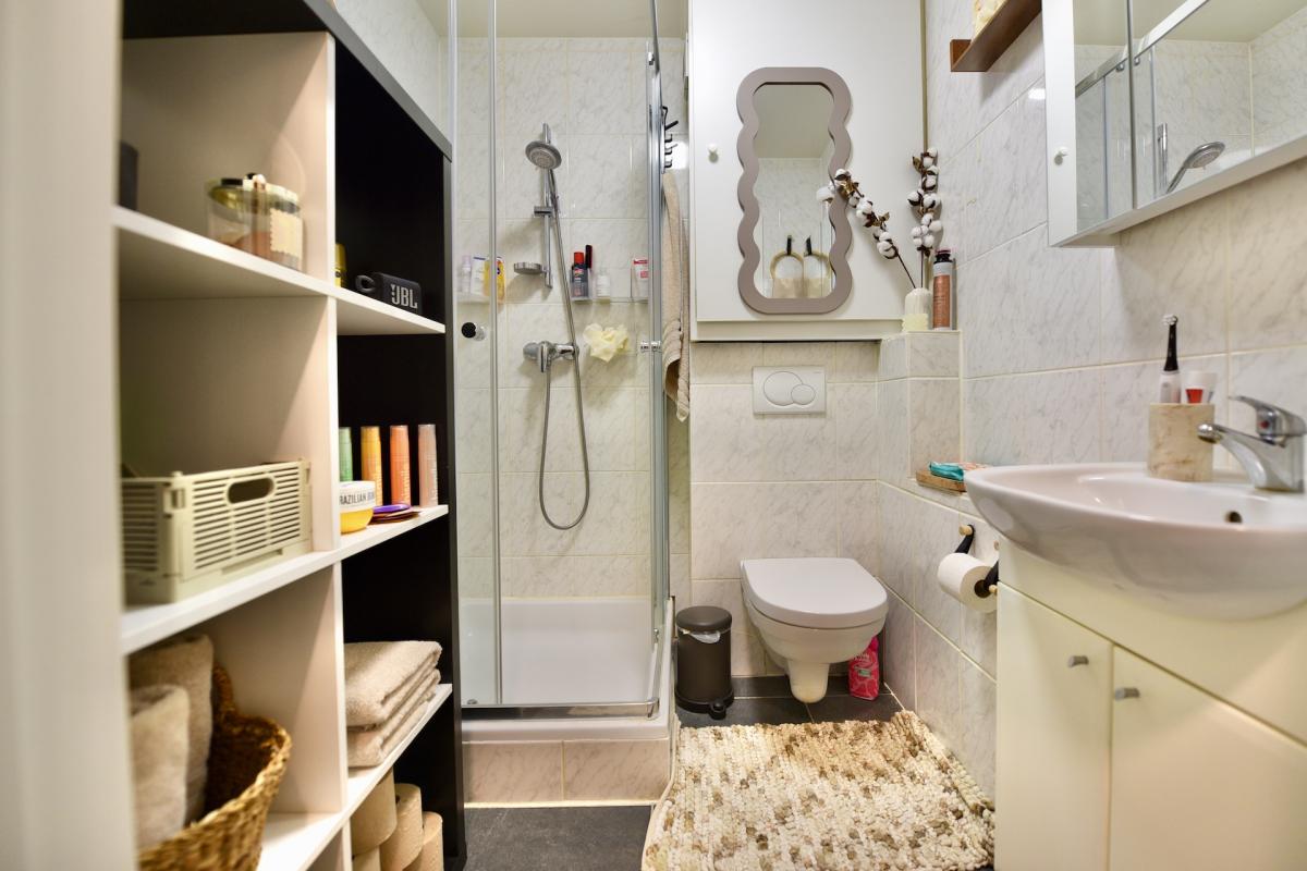 De badkamer is voorzien van een douchecabine, toilet, lavabo en badkamermeubel. Hier is ook nog ruimte om kasten of rekken te voorzien om uw spullen op te bergen.
