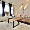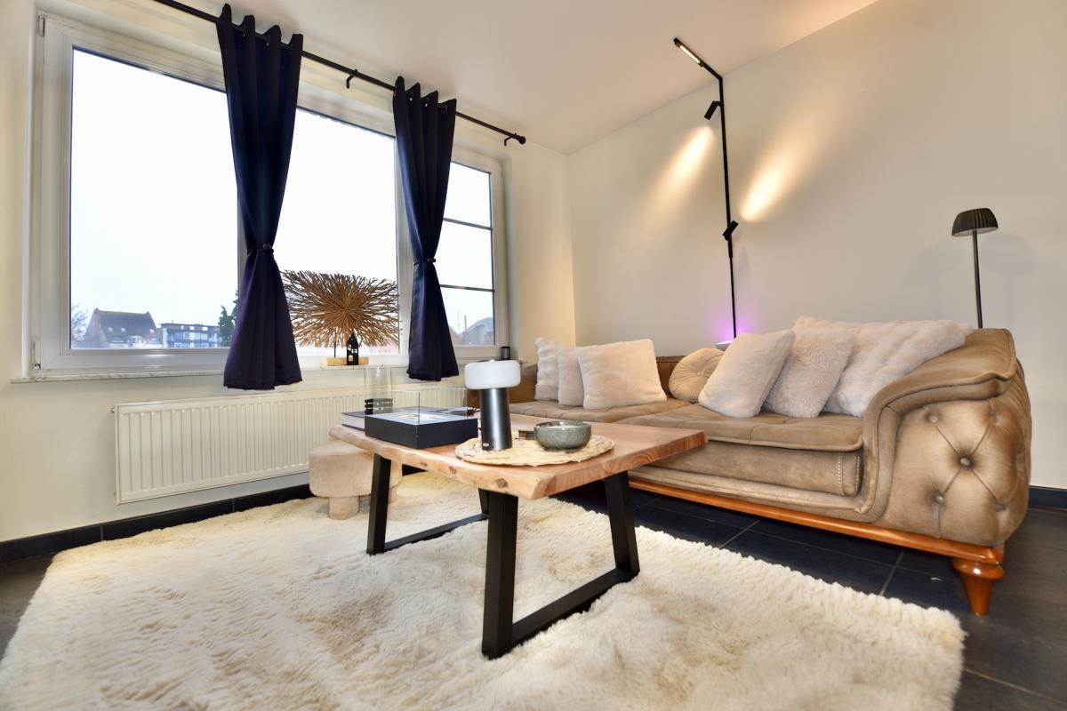 De lichtrijke leefruimte omvat een volledig praktische en ingerichte keuken, een eetplaats en een gezellige zitplaats.