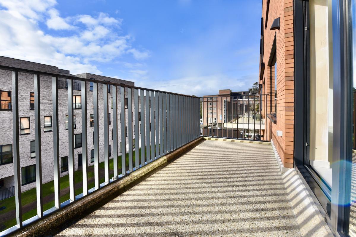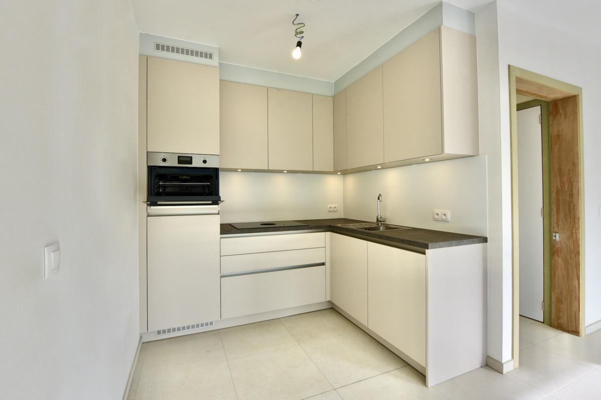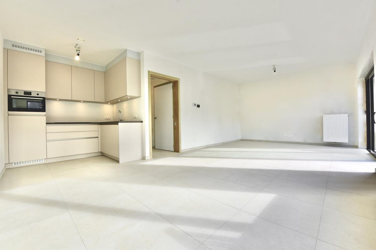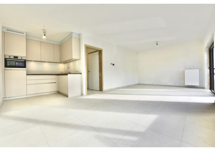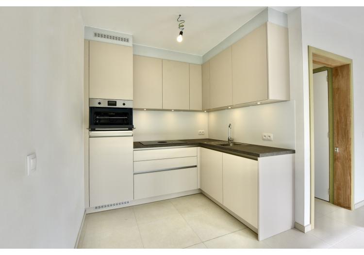 Via een wandelpad tussen het groen bereikt u de inkomhal met lift. Dit appartement beschikt over een open leefruimte met aansluitend een zonnig terras en een volledig ingerichte keuken.