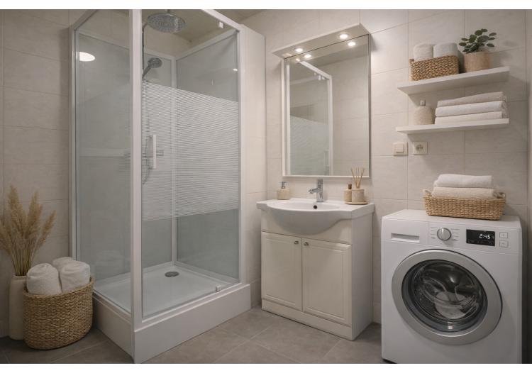 Beide slaapkamers bieden toegang tot het westelijk terras, wat extra licht en een gevoel van openheid creëert. De badkamer is mooi afgewerkt met douche, lavabomeubel en plaats voor de wasmachine. In de kelderverdieping beschik je tevens over een ruime, private kelder.