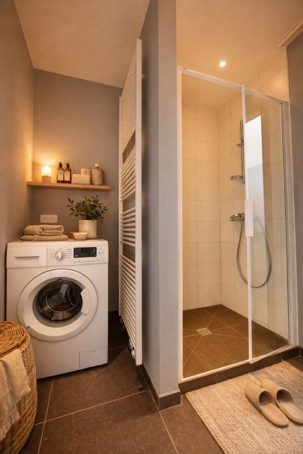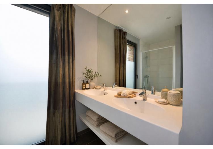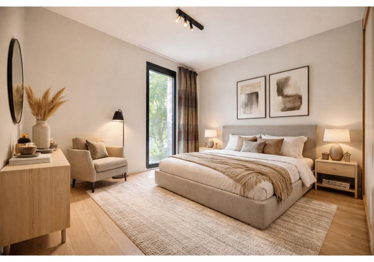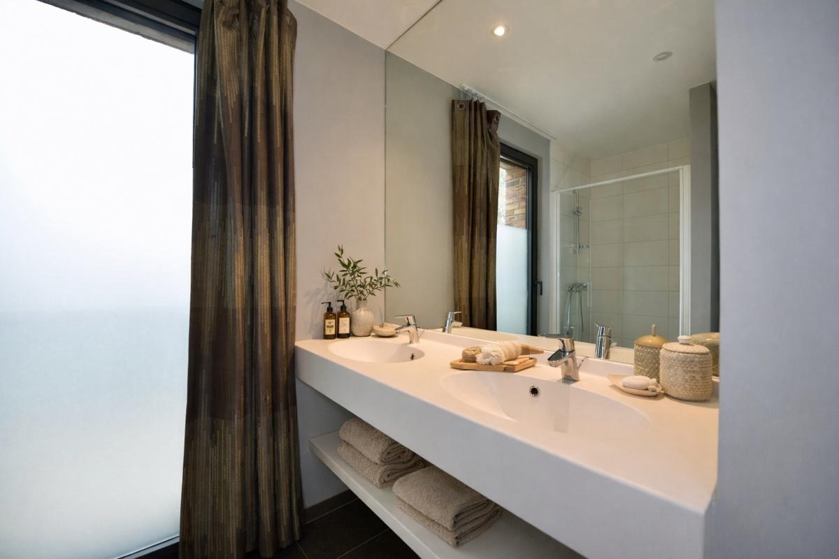 De indeling is bijzonder praktisch en optimaal benut. Het appartement beschikt over twee volwaardige tweepersoonsslaapkamers. De eerste kamer leent zich perfect als comfortabele master bedroom of als stijlvol thuiskantoor met zicht op het groen, terwijl de tweede slaapkamer eveneens ruim en lichtrijk is. De moderne badkamer is uitgerust met een dubbele lavabo, een verzorgd badkamermeubel, een ruime inloopdouche en een aansluiting voor de wasmachine. Daarnaast is er een apart gastentoilet met lavabo. Elke ruimte werd doordacht ingericht met oog voor comfort en functionaliteit.