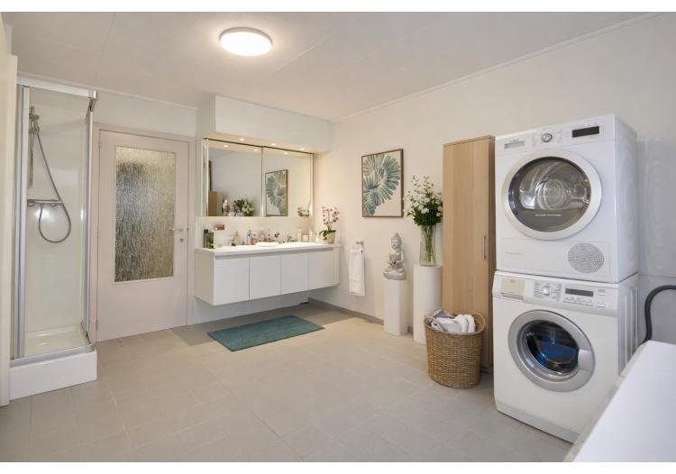Wasruimte in de ruime badkamer, voorzien van ingemaakte kasten