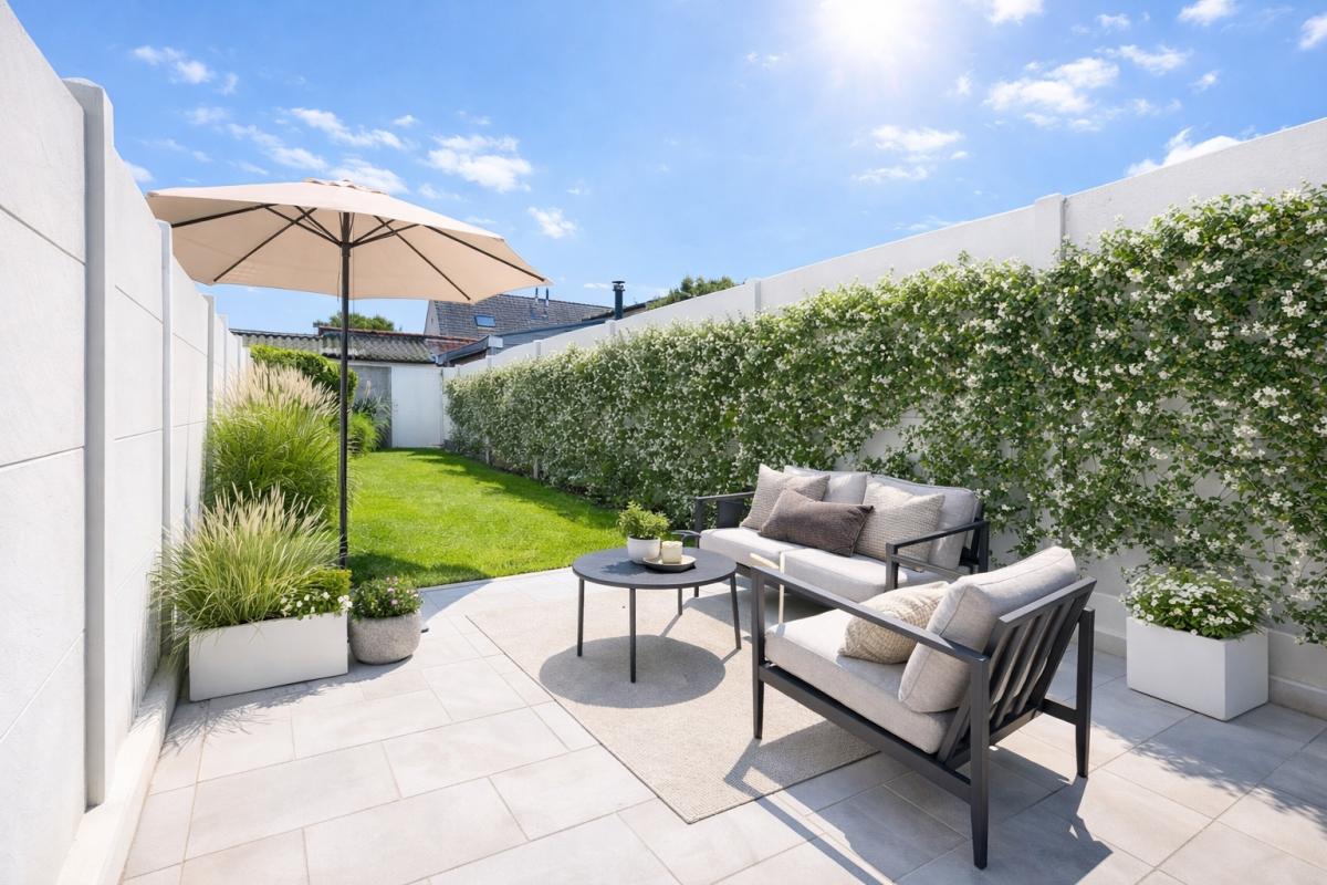 Het zuidgericht terras met aangelegde tuin vormt een echte meerwaarde. Achteraan bevindt zich een aparte buitenberging, bereikbaar via een handige uitweg — ideaal voor stockage, leveringen of fietsen.