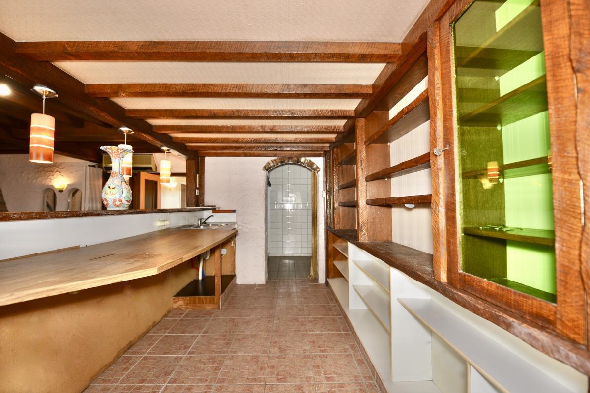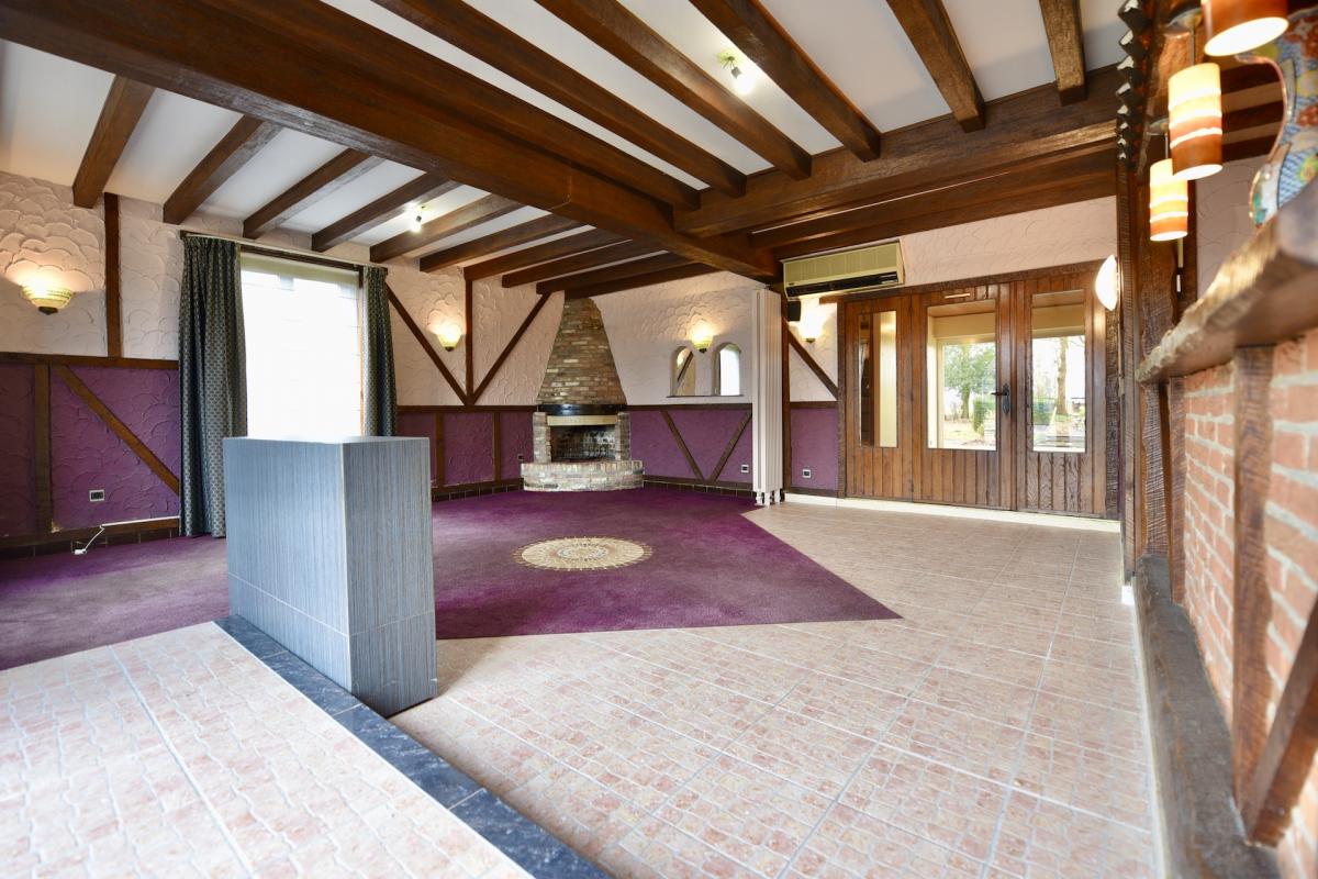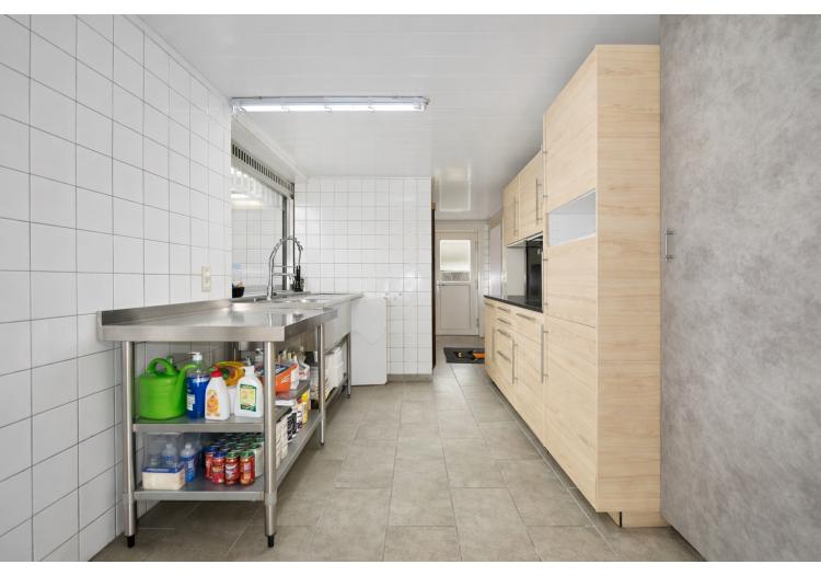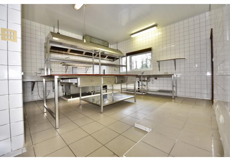 | Keuken 1 | professionele keuken met inox toestellen/rekken voorzien van meerdere gootstenen, een professioneel gaskookfornuis met vijf pitten, inox eiland en houtlook ingemaakte keukenkasten, ruimte om een grote koelkast/koelcel te plaatsen, dampkap. Aansluiting op gasflessen. | |