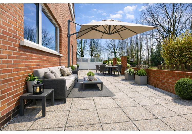 | Terras | 43 m² | groot terras met aansluitend de tuin en zicht op de vijver |