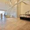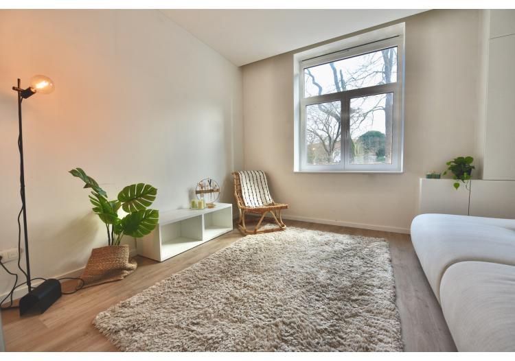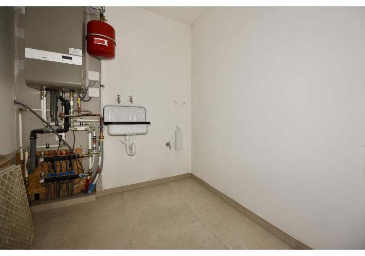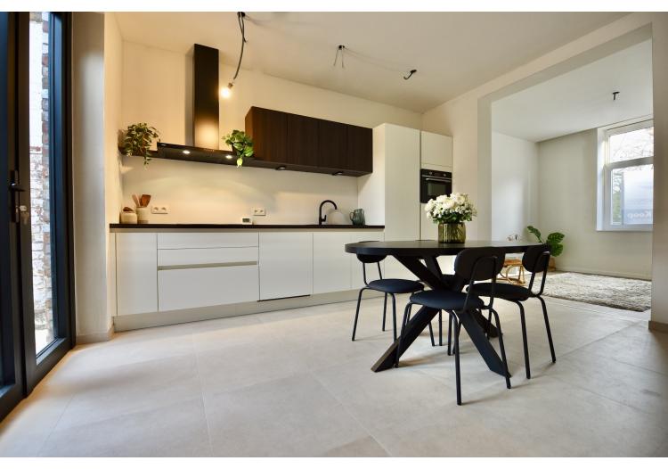 De open leefruimte met keuken, eetplaats en zitplaats baadt in het licht en biedt een mooi zicht op het terras en de stadstuin. Aansluitend aan de keuken bevindt zich een praktische berging die ook als wasplaats fungeert.