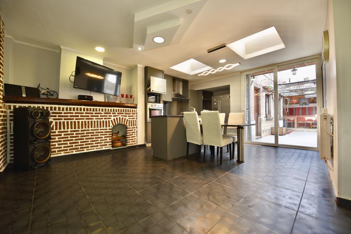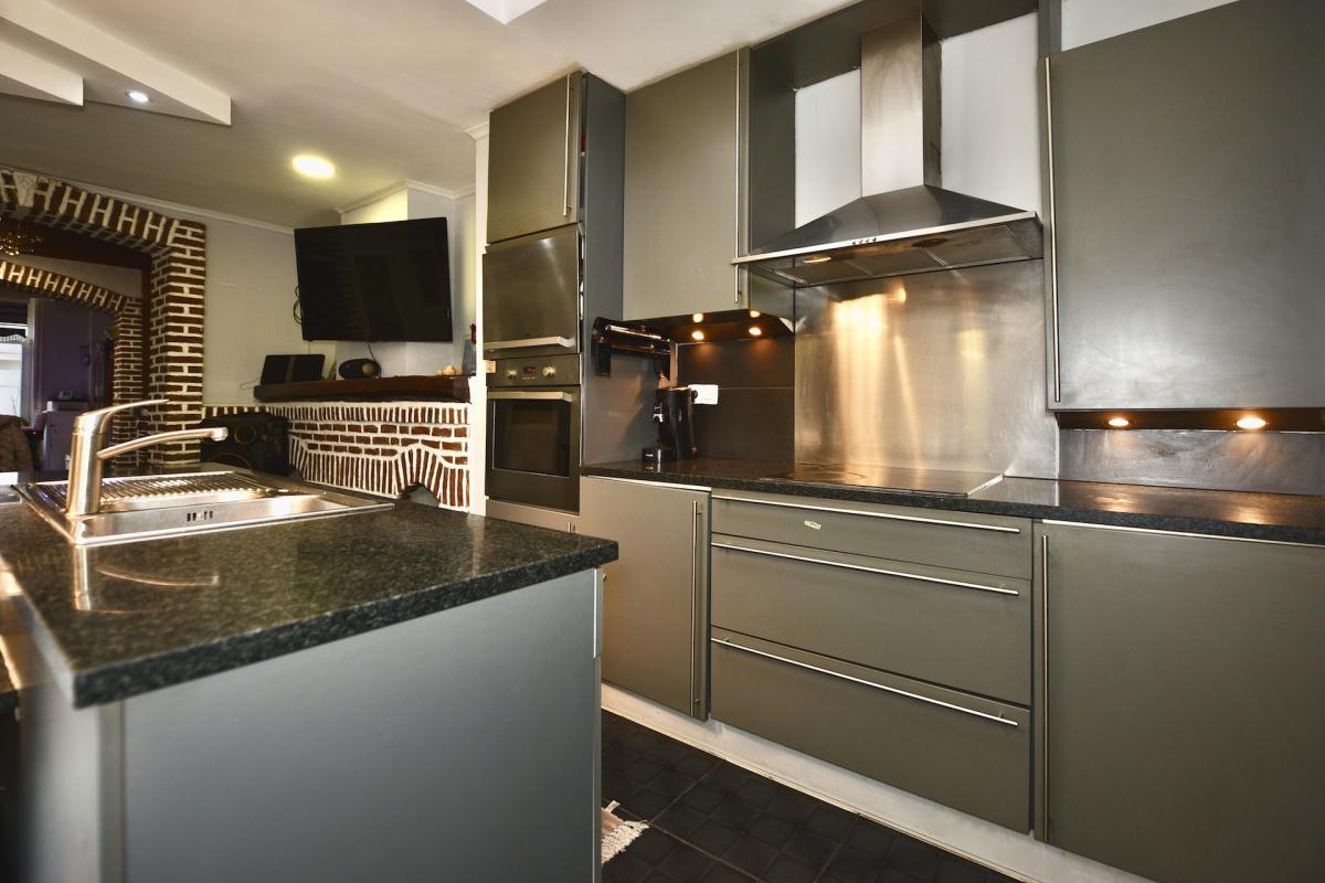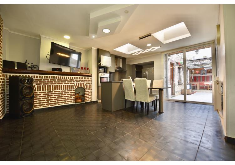 De volumineuze, open keuken met lichtkoepel beschikt over een eigen gezellige eetplaats die in verbinding staat met de gezellige stadstuin. Naast de keuken bevindt zich een apart gastentoilet met lavabo.