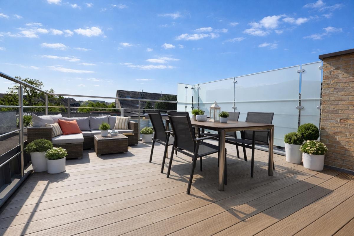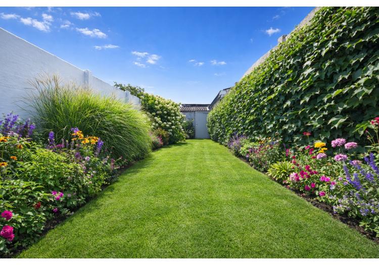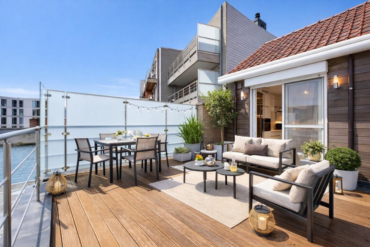 Het zuidgericht terras met aangelegde tuin vormt een echte meerwaarde. Achteraan bevindt zich een aparte buitenberging, bereikbaar via een handige uitweg — ideaal voor stockage, leveringen of fietsen.