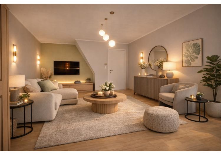 Op de verdieping geniet u van een warme, open leefruimte met tijdloze keuken, eetplaats en salon, met zicht op het tweede zonneterras en de tuin. Verder beschikt de woning over een ruime slaapkamer met ingemaakte kasten en een afgewerkte zolderkamer die perfect kan dienen als tweede slaapkamer of extra bergruimte.