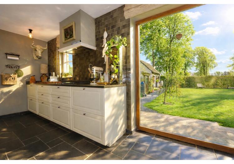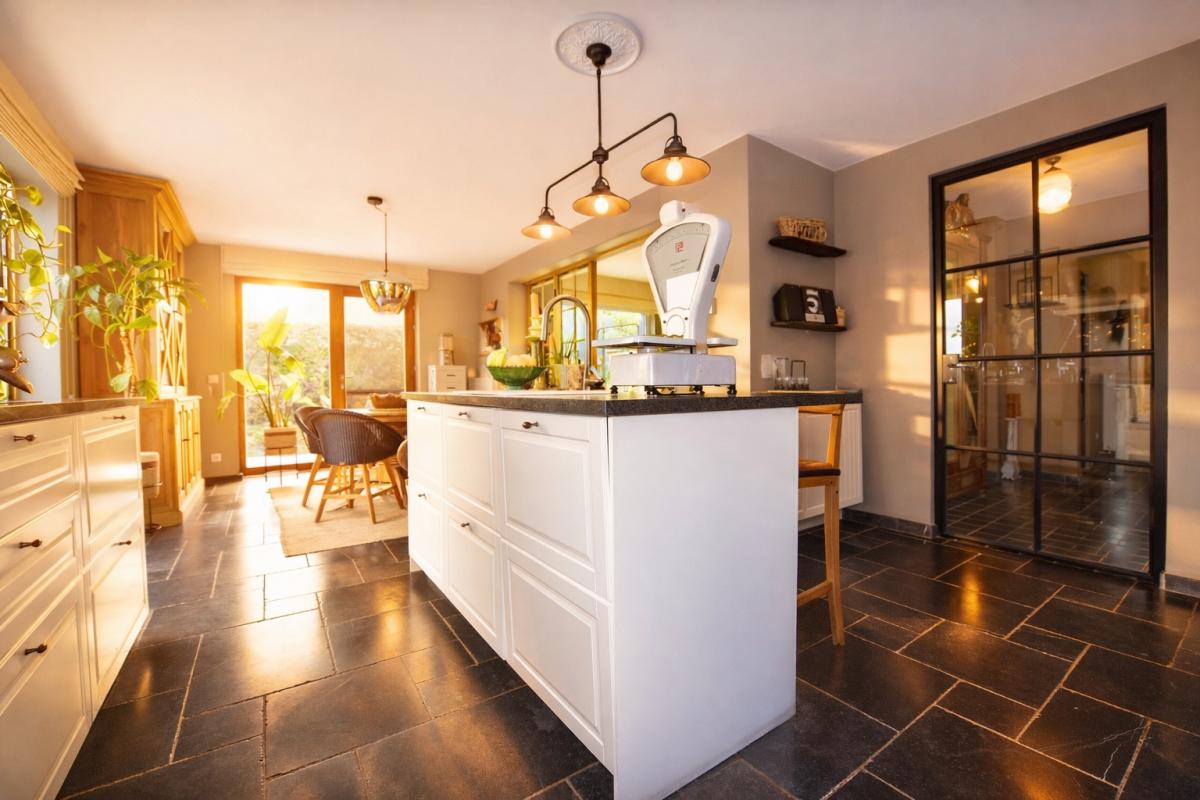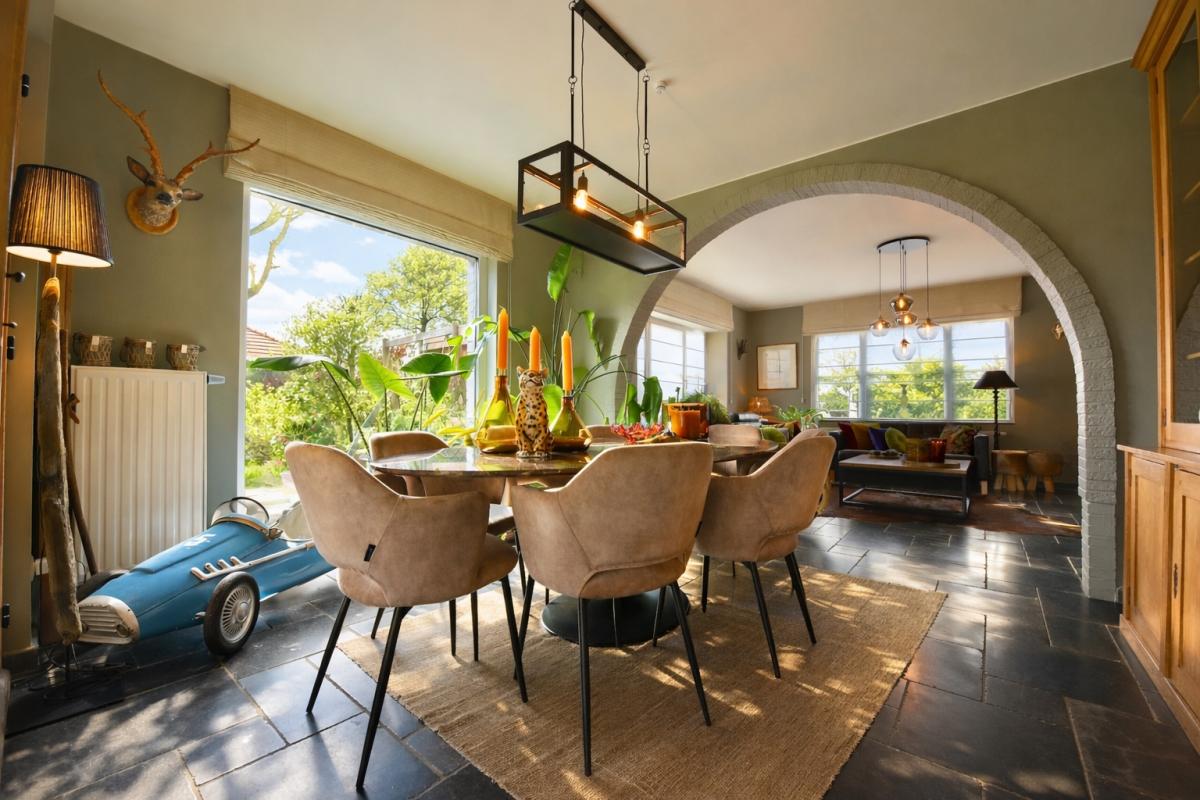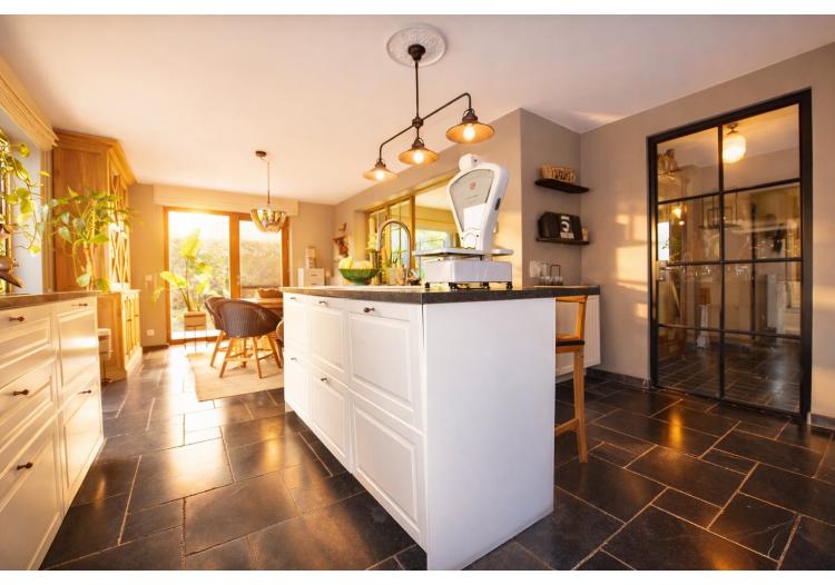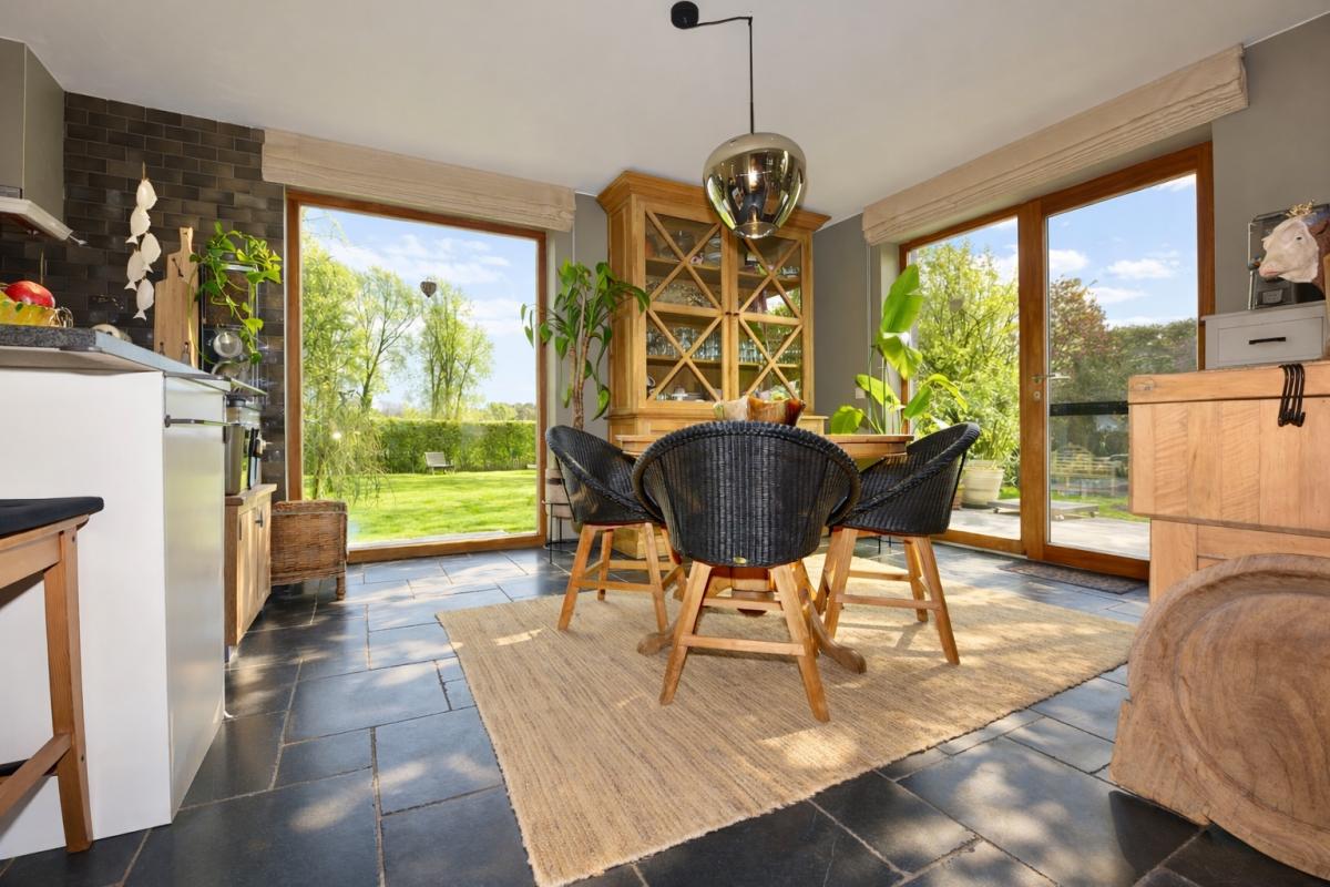 Bij het binnenkomen wordt u meteen gecharmeerd door de lichtrijke en bijzonder praktische indeling van de leefruimtes. De prachtige uitbouw zorgt voor een overvloed aan natuurlijk daglicht en creëert een harmonieuze verbinding met de tuin. Zowel de keuken, het salon als de leefruimte genieten van dit ruimtelijke en open gevoel. De stijlvolle landelijke keuken vormt het warme hart van de woning en beschikt over een gezellige eethoek en talrijke opbergmogelijkheden. Aansluitend bevindt zich een ruime en functionele wasplaats, wat het dagelijkse comfort aanzienlijk verhoogt.