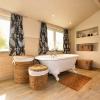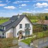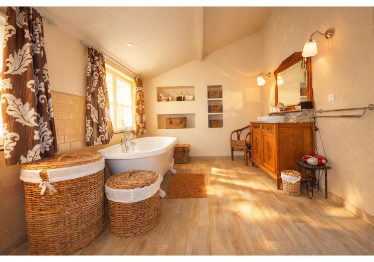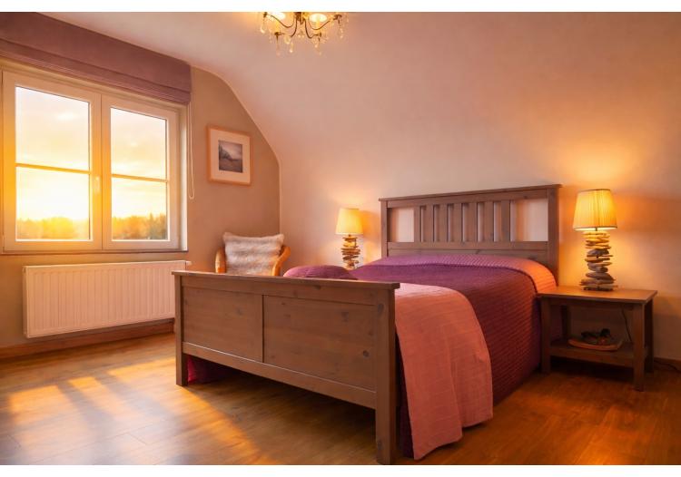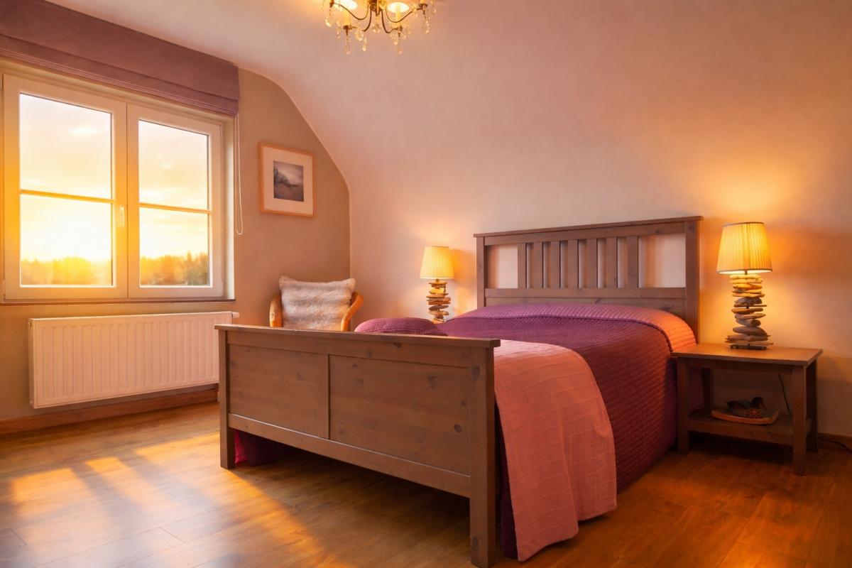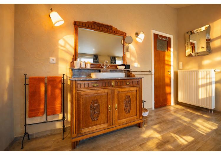 Op de eerste verdieping bevinden zich drie volwaardige tweepersoonsslaapkamers, waarvan één met dressing. Elke kamer geniet van een open en groen uitzicht, met zicht op een grote vijver – een oase van rust en privacy. De charmante badkamer ademt klasse en elegantie, en is uitgerust met een romantisch bad op pootjes, een inloopdouche, toilet en uniek lavabomeubel, afgewerkt met duurzame en kwalitatieve materialen.